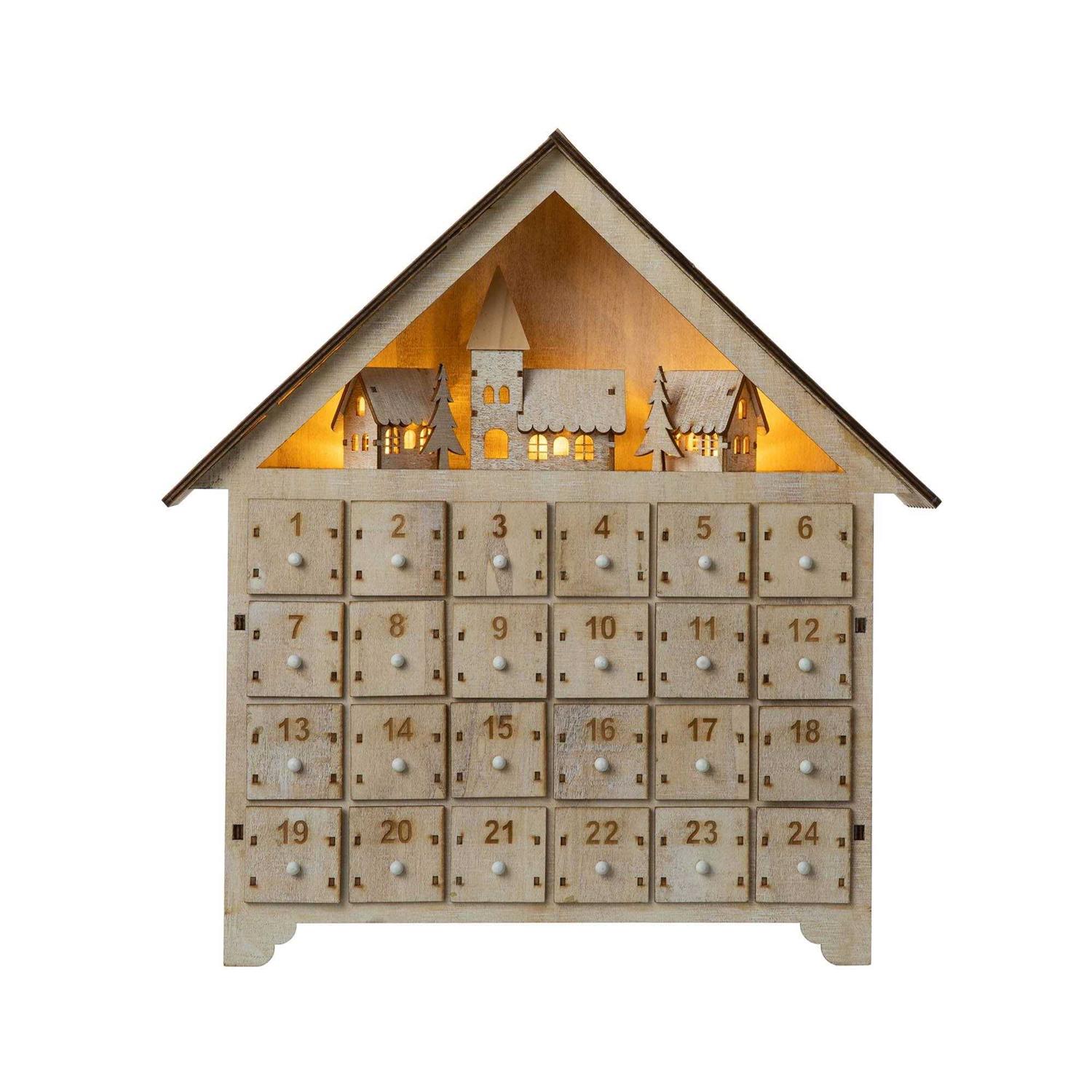 Count down the days until Christmas with this very special farm house display countdown calendar. Display this decor in a family room or in any other gathering area and at night your family and friends can enjoy the warm glow of the homes being lite when you hit this decors light switch. Holiday poem on the back encourages family communication and a festive read-aloud ritual.