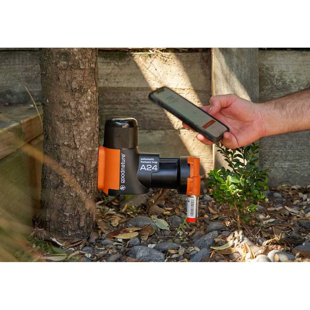 Please Read! Trapping rats can be difficult and no method is guaranteed to work immediately. It can take days or even weeks to find the right place for your trap. If you do not follow the instructions to set up your trapping area properly, you might not have success. Trapping rats is a lot like fishing — the world’s best fishing equipment doesn’t guarantee success. The new A24 SMART Rat & Mouse trap Kit. Arm your home, yard, and business with Goodnature’s quick kill, self-resetting A24 traps, rat bait station, and start living pest-free. The A24 trap works on rats and mice, indoors or outdoors, and instantly kills the nasty rodents while keeping your pets and family safe. Made with high-quality materials, the long-lasting paste only requires checking monthly, rat bait stations. plus each CO2 canister lasts for 24 kills. The Smart Trapping Set includes a trap, a portable stand, one CO2 canister, paste taster cards, and a 6-month supply of A24 Chocolate Formula Paste. *This Smart Trapping Kit uses smart Bluetooth technology to count and track success on the Goodnature smartphone app.