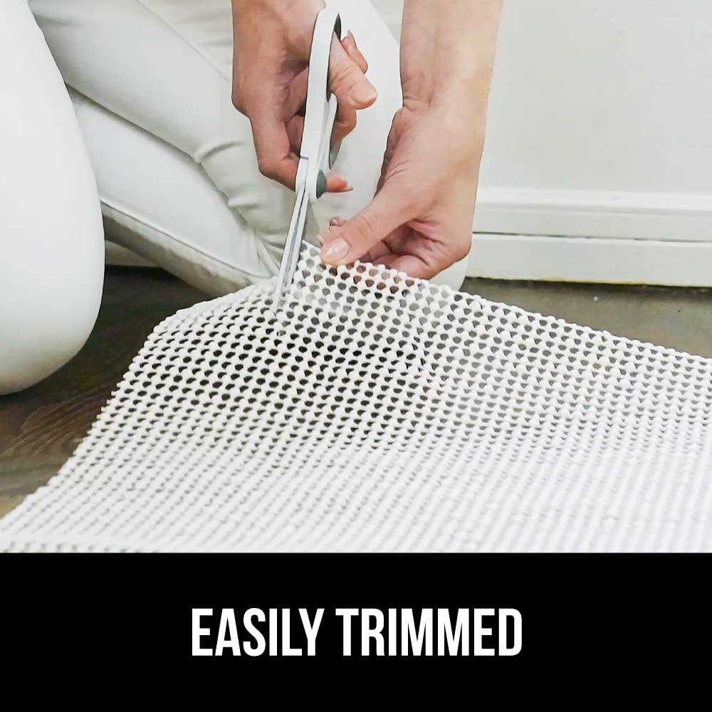 THE ORIGINAL EXTRA STRONG GRIPPER: our trusted Gorilla Grip nonadhesive rug pads offer a unique, dual sided grip that firmly holds onto both the rug pad and your hard floor to help prevent rug movement REDUCES RUG BUNCHING AND SLIDING: slip resistant pads help reduce rug bunching and sliding, even over high traffic areas in your home; the ideal option for homes with kids and pets SUPERIOR FLOOR PROTECTION: open grid design allows floors to breathe and helps protect from damage; rug pads are reversible, vacuum friendly, and constructed from premium materials THICK AND LONG LASTING CUSHIONING: thick cushioning adds extra comfort helping to make rugs cozier and softer under foot; rug pads also help reduce everyday noise in busy areas; constructed of premium materials for long lasting quality to help keep rugs in place for years to come EASY INSTALLATION, TRIM TO SIZE: available in the most popular sizes for easy installation, this pad measures 2.5 feet by 13 feet; easily trim pad with scissors for unique sizes and shapes; put the pad down, place the rug on top and trim off any excess material Tired of straightening your area rugs day after day? Here is what makes ours so effective: br br CAN THIS HELP WITH MY RUG BUNCHING? Yes, this skid-resistant rug pad for hard floors helps locks rugs in place. It also helps with moving and bunching. br br DOES IT PROVIDE FLOOR PROTECTION? Of course. The open grid construction allows rugs to breath and helps to make vacuuming easier. This rug pad is also washable! br br CAN I TRIM THIS RUG PAD FOR CUSTOM SIZES? Absolutely. You can easily cut this rug pad with a household scissor to fit any non standard sized rug.