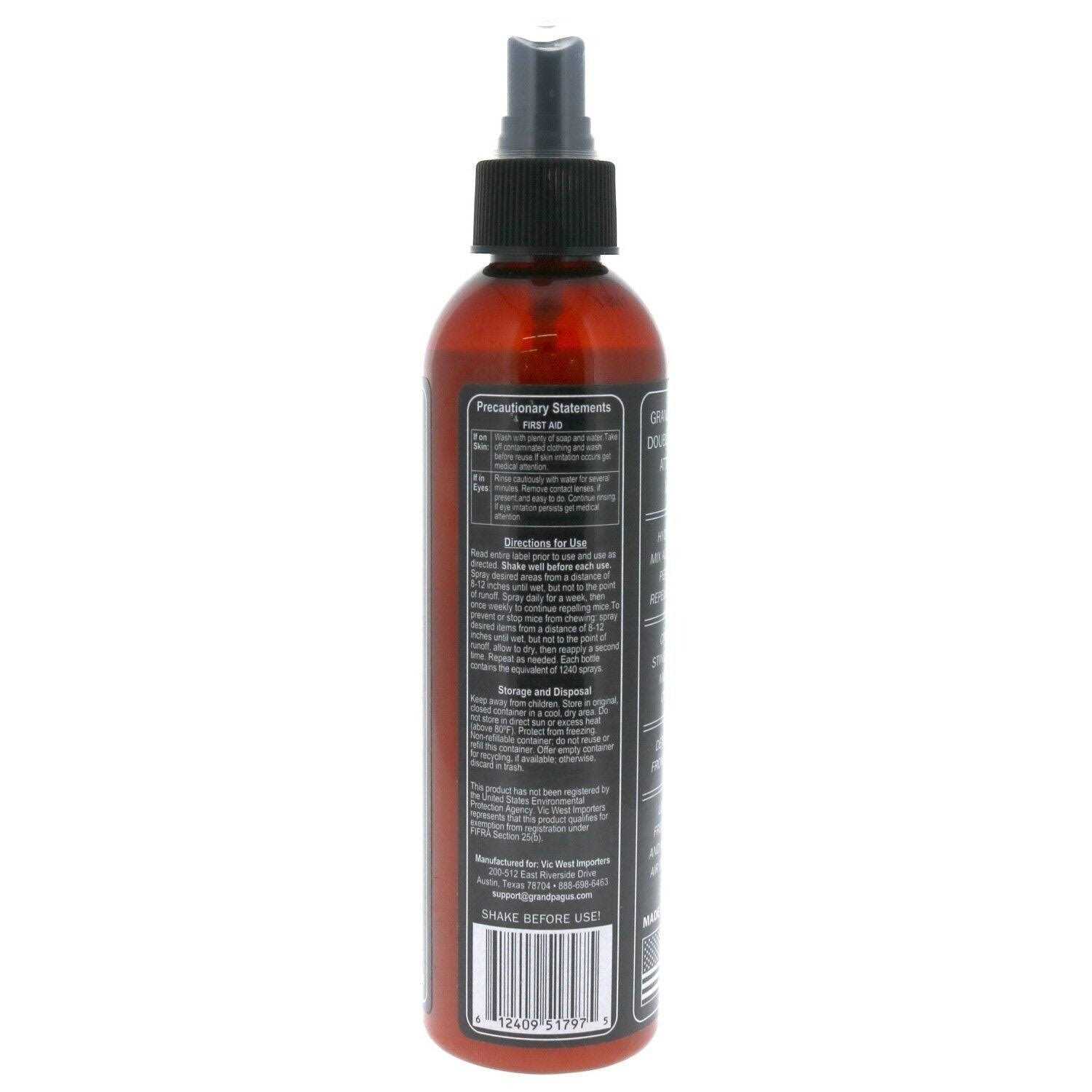 - With a water-based formula Grandpa Gus’s peppermint repelling formula spreads faster than non-scientific formulas, it also leaves no stains