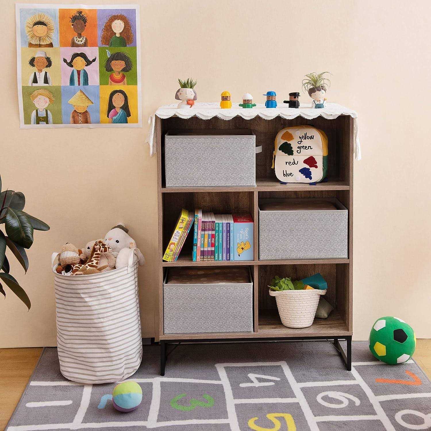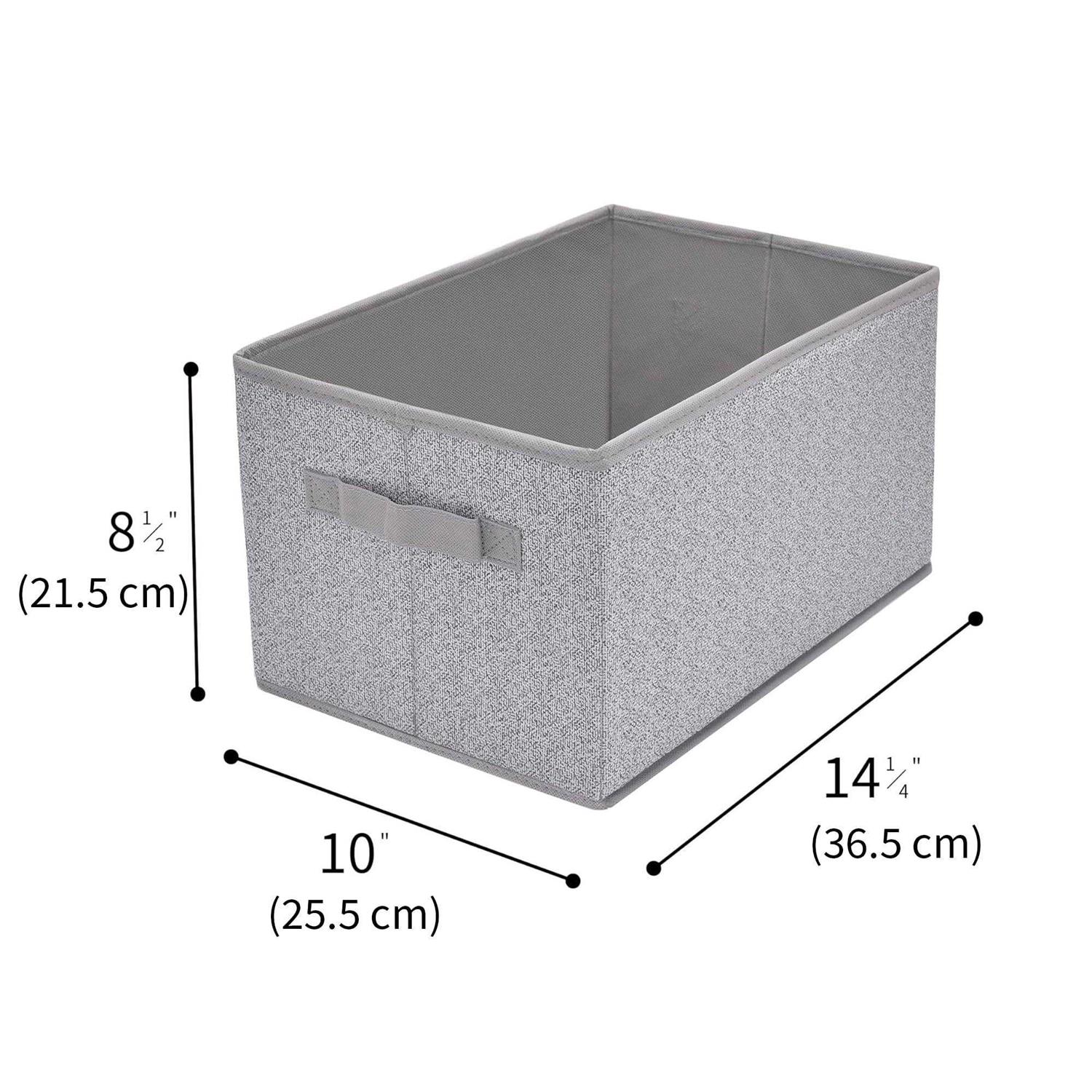 Clothing storage bins measure 14.4 x 10 x 8.3 inches, made of 100% polyester fabric. Featuring 2 handles, the closet baskets are easy to carry for transportation. Cloth bins for closet organization can keep the shape even nothing filled, since there are quality cardboards underneath fabric and a bottom insert. The lidless design of gray storage bins makes it perfect for wardrobe shelves organization, convenient to find what stored inside cloth bins without rummaging around. Ideal storage baskets for shelves to organize towels, tee shirts, accessories, magazines, notebooks in the closet room, living room, den, etc.