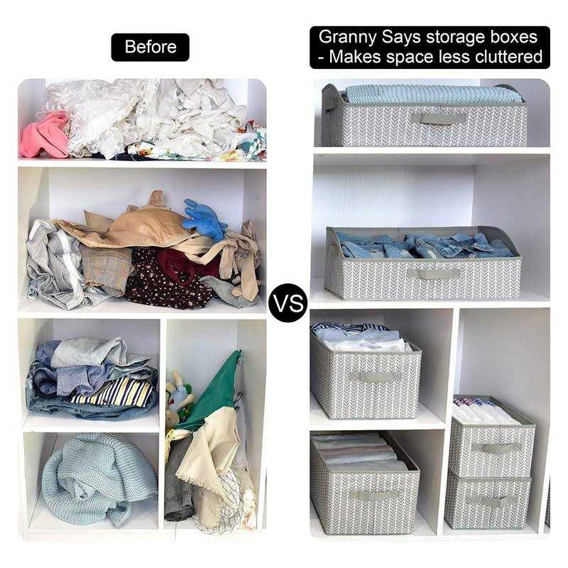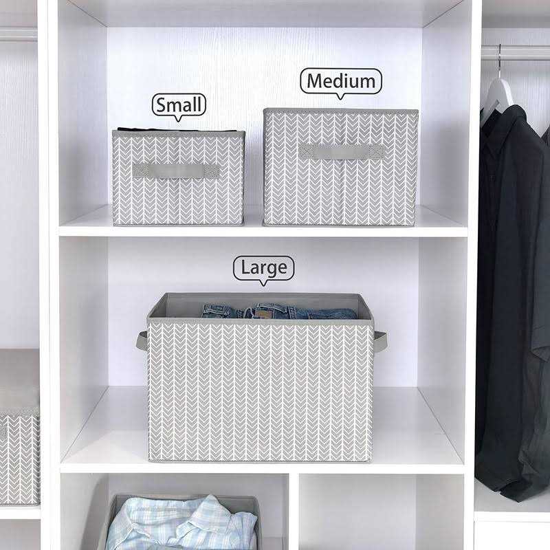 - The lidless design of gray storage bins makes it perfect for wardrobe shelves organization.