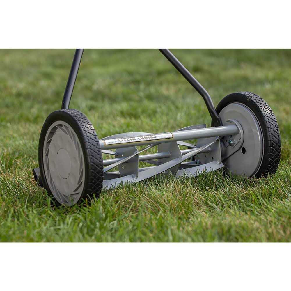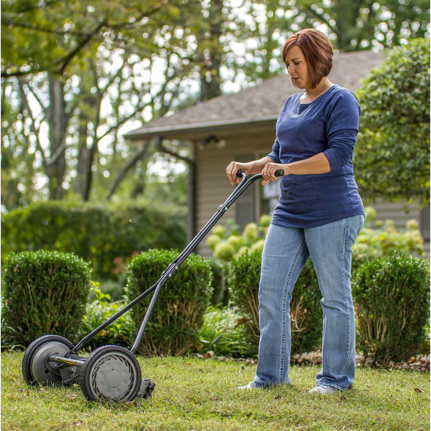 - Lightweight lawn mower has 16″ cutting width, 5-blade ball bearing reel, and 10″ composite wheels for optimal maneuverability