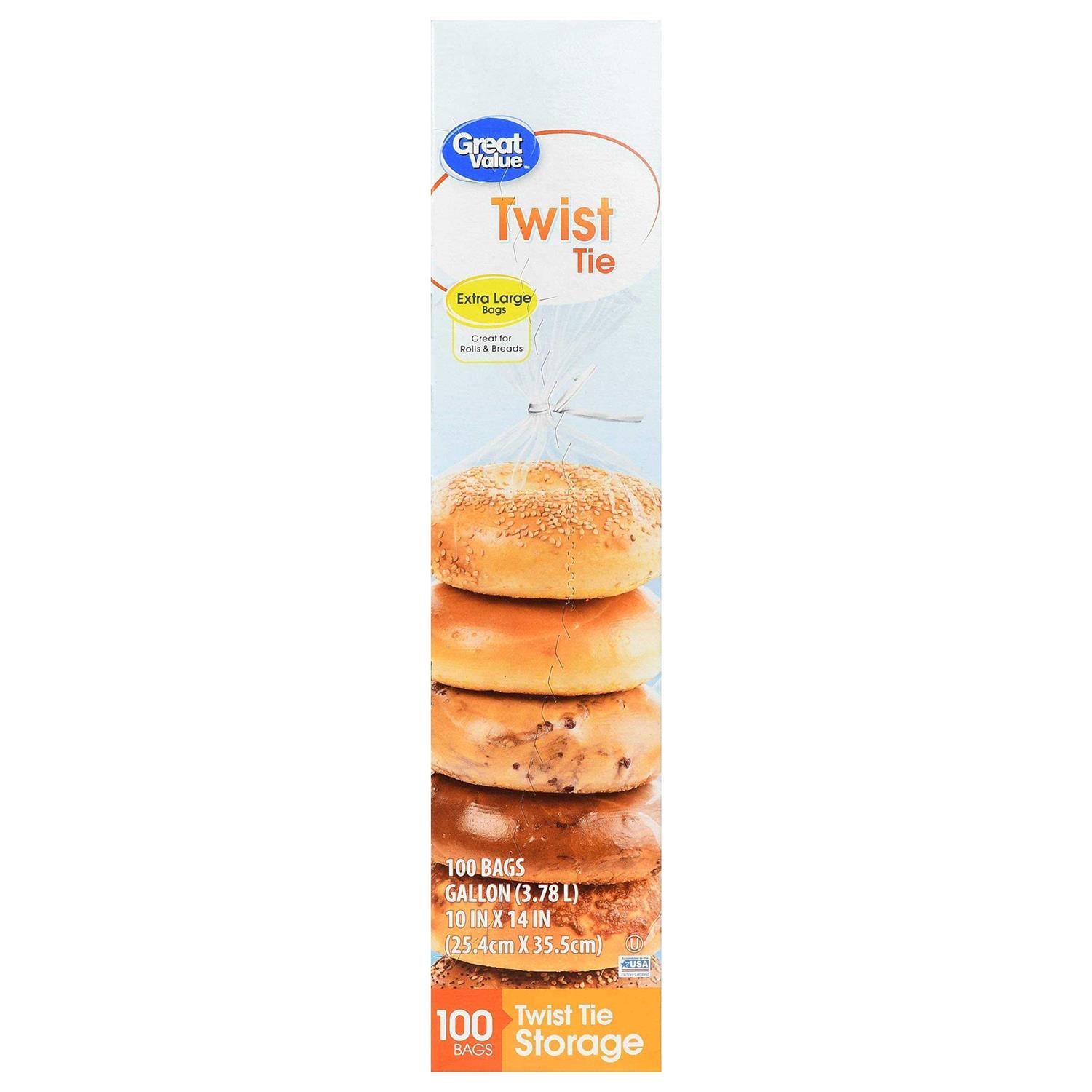 Store your food and organize your kitchen with these Great Value Twist Tie Storage Bags. They provide a quality way to store all kinds of foods and are ready to use when you need them. Each bag comes with a twist tie that is soft enough to twist easily and firm enough to hold its shape to lock in the freshness of the items stored inside. They are perfect for keeping bread and rolls fresh, marinating meat for the grill and provide a maintaining solution for crumbling cookies and crackers. Add a ribbon over the twist tie to turn treats like cookies and candy into a quick gift. It is easy to carry while traveling and can help keep your toiletries, electronics and accessories organized and protected. This pack comes with 100 gallon-size Great Value Twist Tie Storage Bags, meaning that each package will offer long-lasting use. Great Value products provide families with affordable, high-quality grocery and household consumable options.