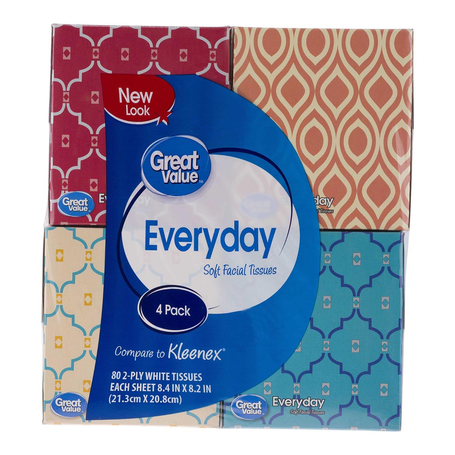 Great Value Everyday Soft Facial Tissues, 320 Sheets, 4 Pack, Size: 80 Tissues