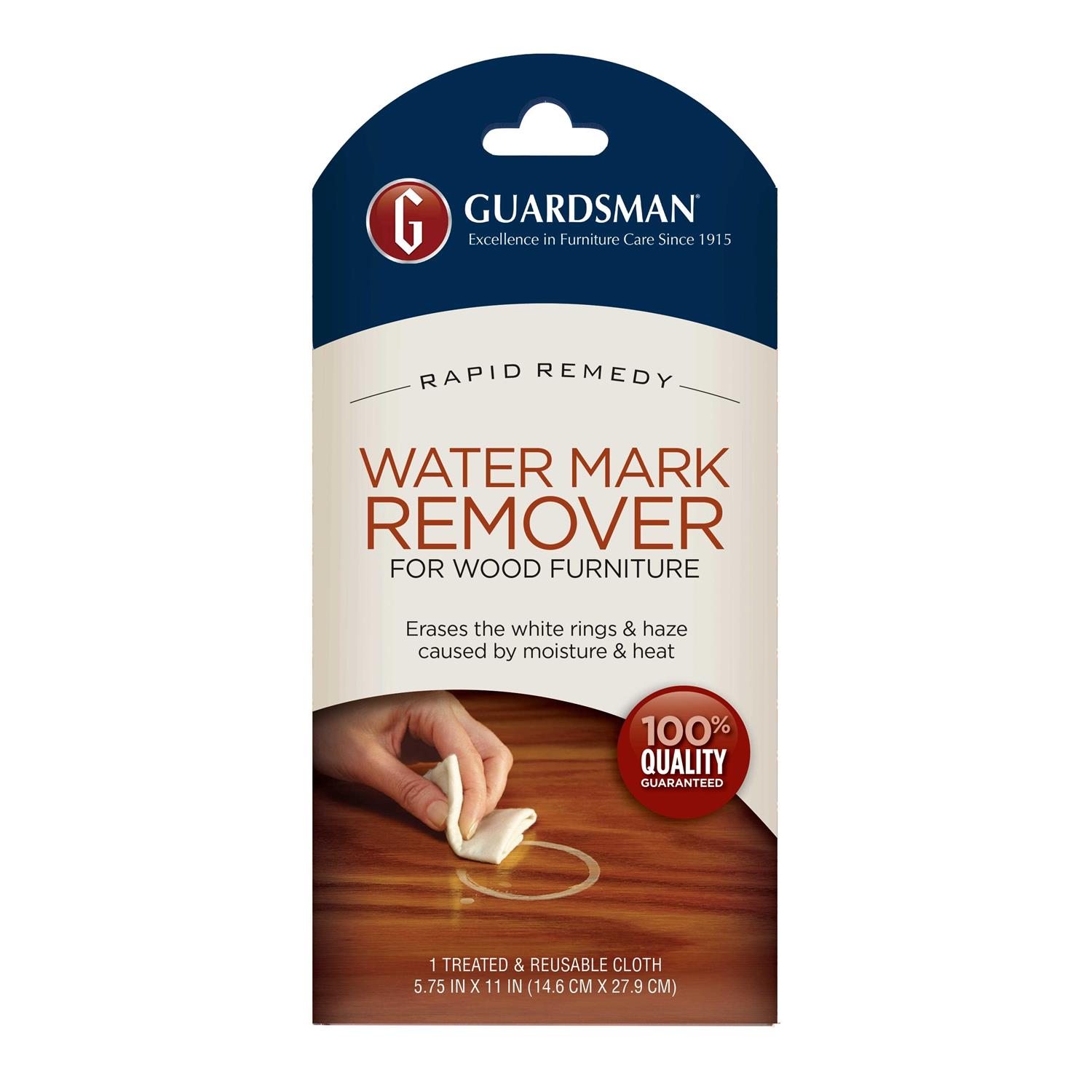Guardsman reusable Water Mark Remover cloth is specially treated to quickly and easily removes heat and moisture marks, minor blemishes and surface scratches from finished, sealed wood surfaces. It also removes latex paint and most permanent marker stains from wood. After each use, simply return the cloth to the resalable package, the cloth lasts as long as it is not dried out or heavily soiled. Recommended by furniture makers.