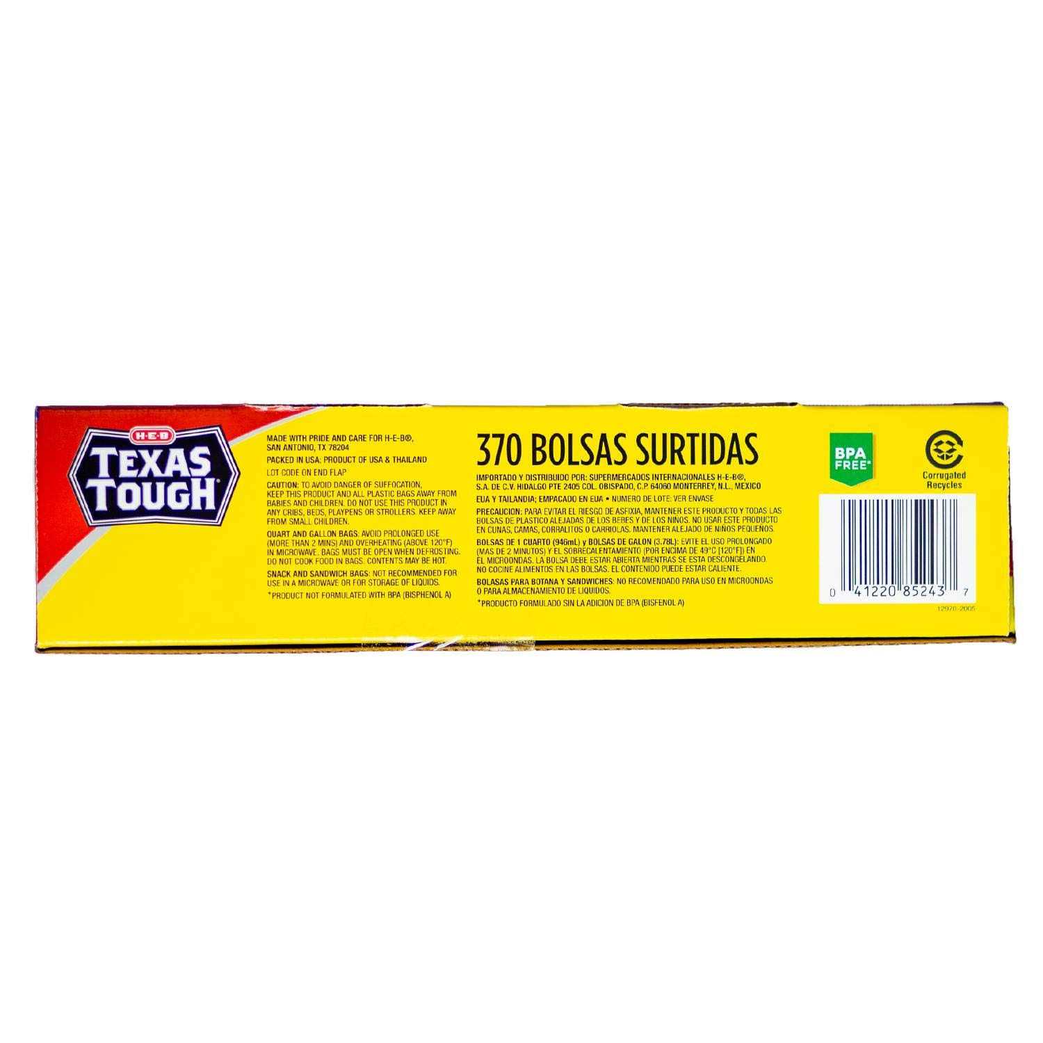 40 – Storage Gallon Bags: 10-9/16 inches x 10-3/4 inches (26.8 cm x 27.3 cm). 50 – Storage Quart Bags: 7 inches x 7-11/16 inches (17.7 cm x 19.5 cm). 80 – Bright-Zip Sandwich Bags: 6-1/2 inches x 5-7/8 inches (16.5 cm x 14.9 cm). 100 – Sandwich Bags: 6-1/2 inches x 5-13/16 inches (16.5 cm x 14.8 cm). Snack Bags: 6-1/2 inches x 3-1/4 inches (16.5 cm x 8.2 cm). Not just tough Texas Tough! H-E-B Texas Tough P Food Bags are perfect for keeping your favorite foods fresh. Try all of our H-E-B Texas Tough items, including foil, storage containers, trash bags, and more. BPA free (Product not formulated with BPA (Bisphenol A). Corrugated recycle. Packed in USA; Product of USA & Thailand.