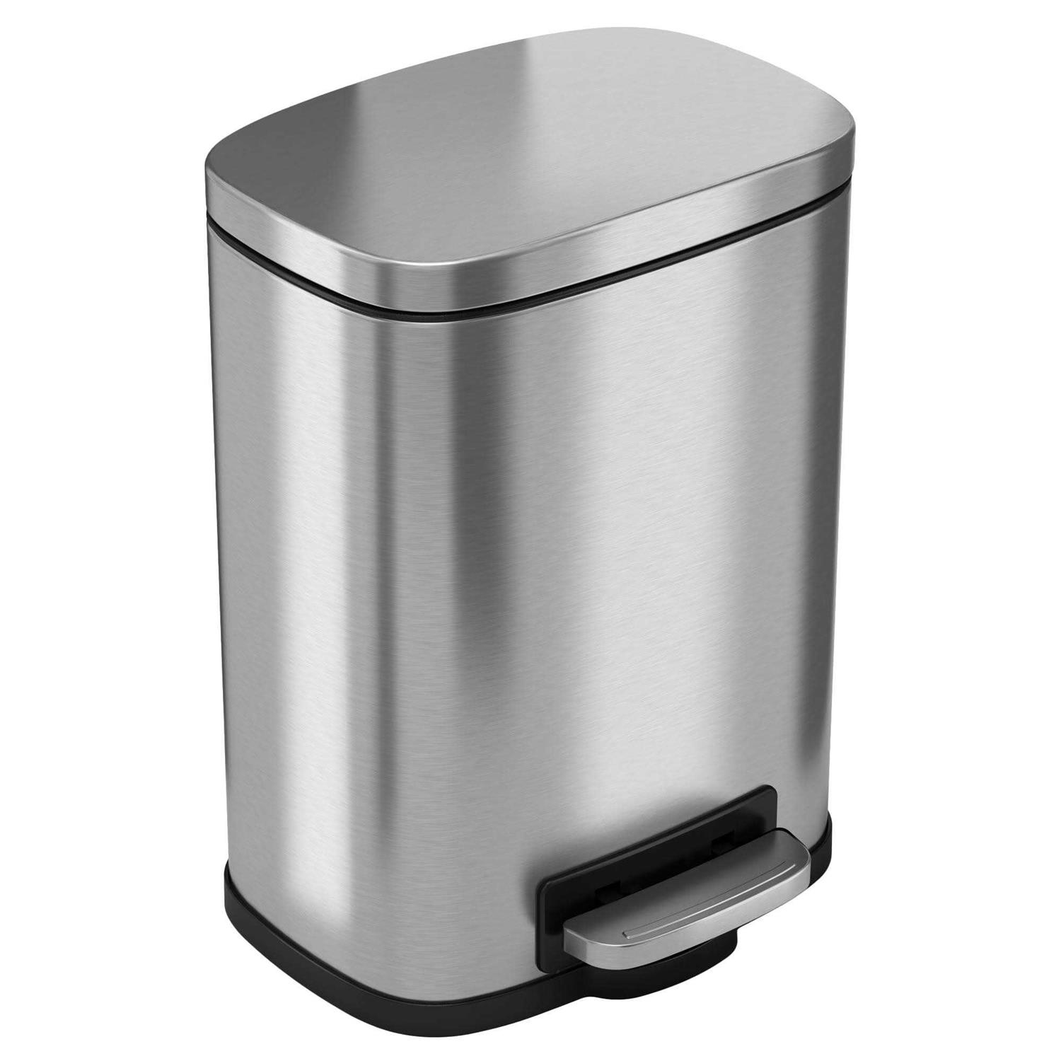 Keep trash neatly contained in this SoftStep stainless steel trash can. The compact design makes this waste bin ideal for use in small spaces, and a convenient carrying handle allows for easy movement anywhere in your home. The fingerprint-proof finish adds a beautiful touch to your kitchen or bathroom. Featuring a wide foot pedal, this SoftStep stainless steel trash can offers hands-free operation for added sanitation. Flip lid Keeps your area looking tidy and smell-free. Fingerprint-proof finish Resists smudges for a shiny appearance. 1.3-gal. capacity Holds plenty of waste items. Foot pedal Allows you to open the trash can even when your hands are full.