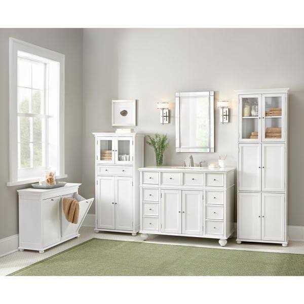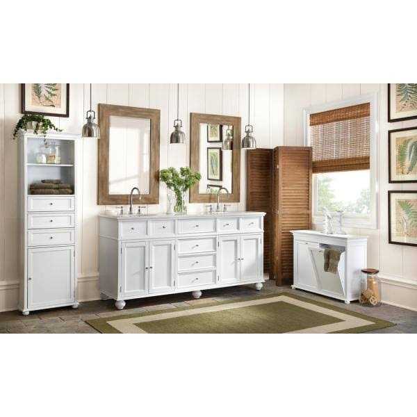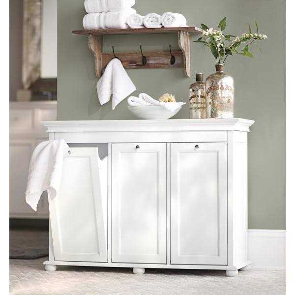 The tilt-out design of the Hampton Harbor Double Hamper allows you to conveniently sort and store your laundry in style. This traditionally designed laundry hamper is durably constructed to withstand heavy use. Its timeless crown molding, recessed panels and bun feet complement a variety of decorating styles, while its lovely white finish brightens your bath. You might also try it in the kitchen to sort recyclables. 2 generous tilt-out hampers A conveniently stylish way to keep laundry out of sight Works well in bathrooms, bedrooms and other shared living spaces Removable, washable cotton lining is conveniently secured by Velcro Features stylish details like recessed panels and bun feet Also works great as a recycling bin Crafted of extra-dense, no-warp wood composite and a solid wood frame 27 in. H x 26 in. W x 13 in. D Inside of hamper (each): 17.5 in. H x 9.25 in. W x 10 in. D Assembly required The entire item is made of MDF except the feet which are made of solid oak The entire item is made of MDF except the feet which are made of solid oak Lining is washable Hampton Bay Tilt-out Hamper Double 26 In. W in White, 2601310410 Bring gleaming beauty and functionality to your living room with the choice of this extra ordinary Hampton Harbor Double Tilt-Out Hamper in White.