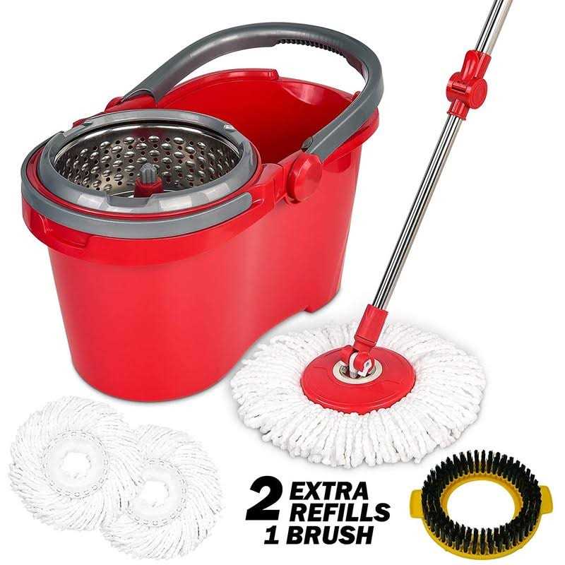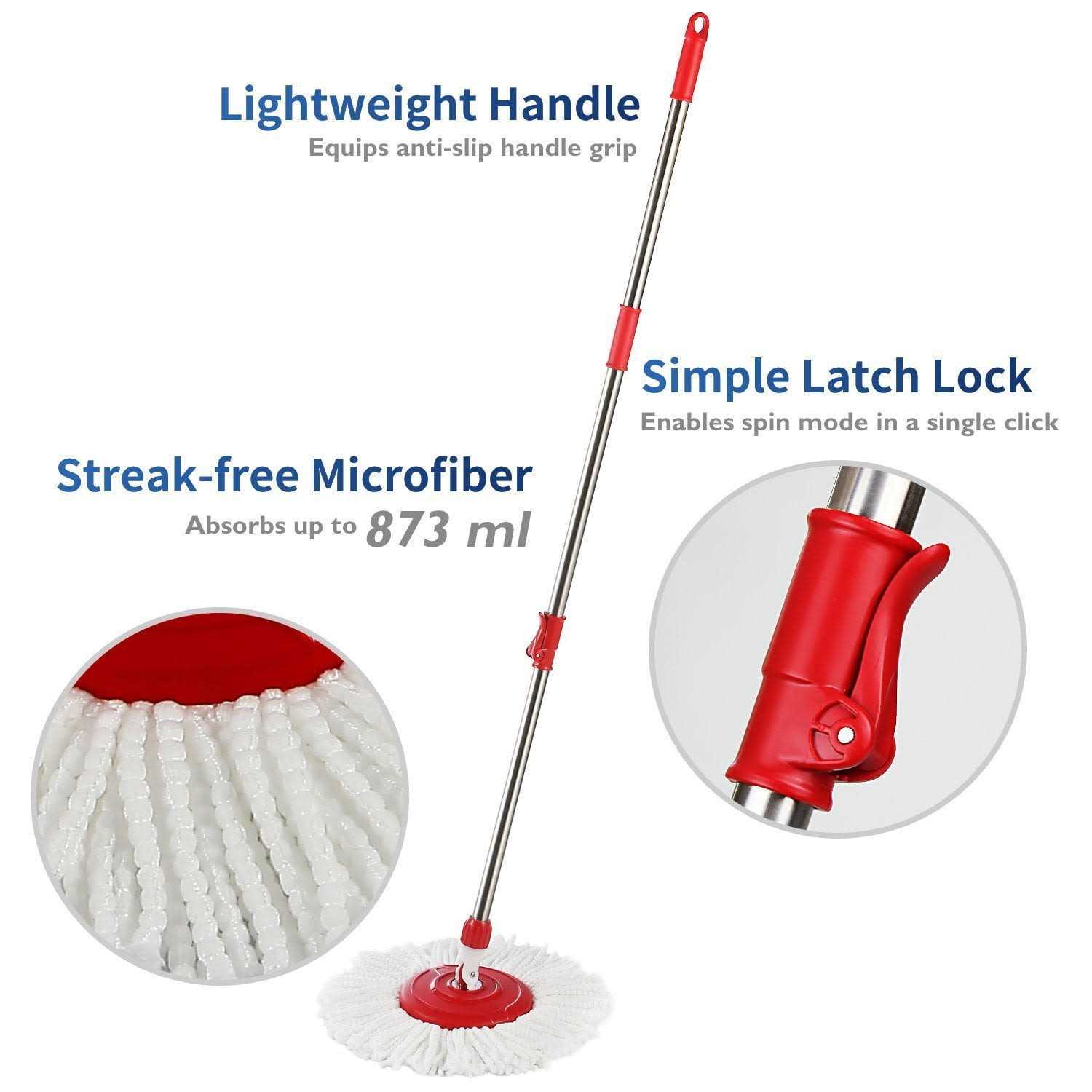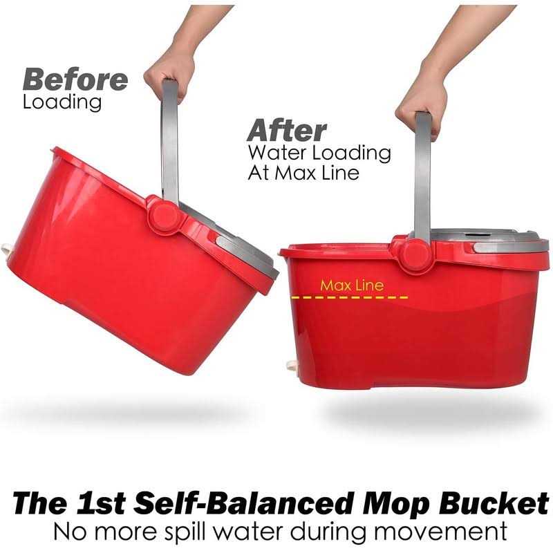 Upgraded Self-Balanced Bucket: No foot pedal, No plastic spinning axis, No other unnecessary moving parts (wheels, agitator) to break or cause leaks. Carry it around your house without the hassle. Ergonomics Design: Now you are given the chance to feel our intimate caring for your tough mopping task, as our 360 swivel head moves flexibly- it rotates up to 180 in order to clean under your furniture and along baseboards.