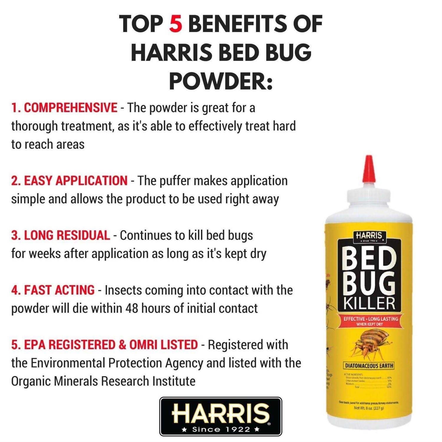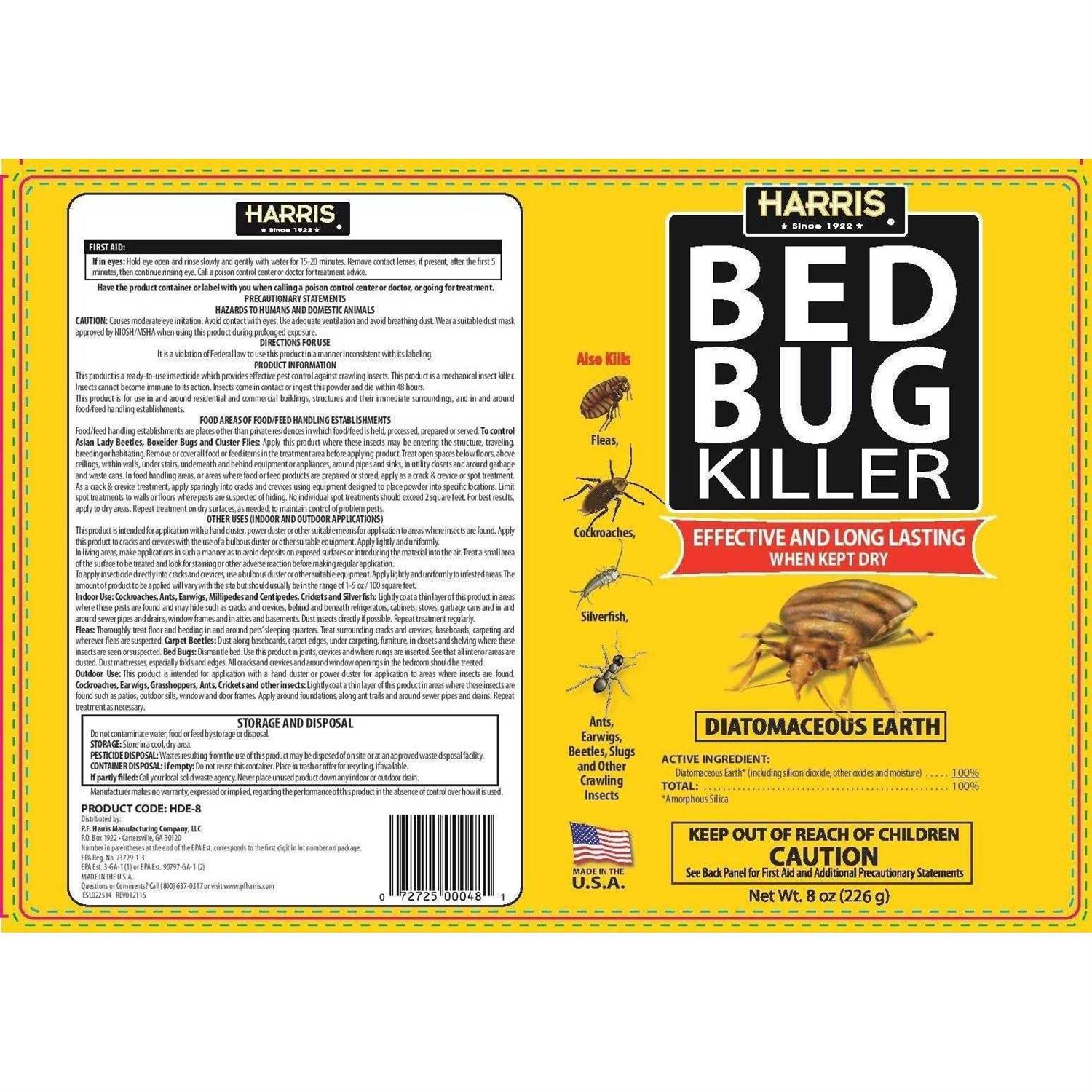 Harris Diatomaceous kills bed bug adults, nymphs and hatchlings. It helps prevent any future infestations. Diatomaceous earth is a naturally occurring powder comprised of crumbled siliceous sedimentary rock that acts like tiny razor blades that cut open the exoskeleton of the bed bug, leading to dehydration. Comes in ready-to-use puffer bottle, allowing quick application in cracks and crevices. Recommended to use in combination with bed bug killer trigger sprays and aerosol egg kill on mattresses and box springs. Odorless and non-staining. EPA registered for outdoor/indoor use including but not limited to mattresses, box springs, window frames and cabinets. Listed with the Organic Minerals Research Institute (OMRI). Residual powder continues to kill bed bugs months after initial indoor application when left undisturbed. Effective and long lasting when kept dry.
