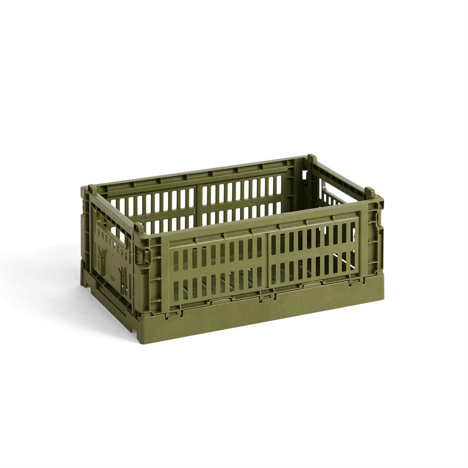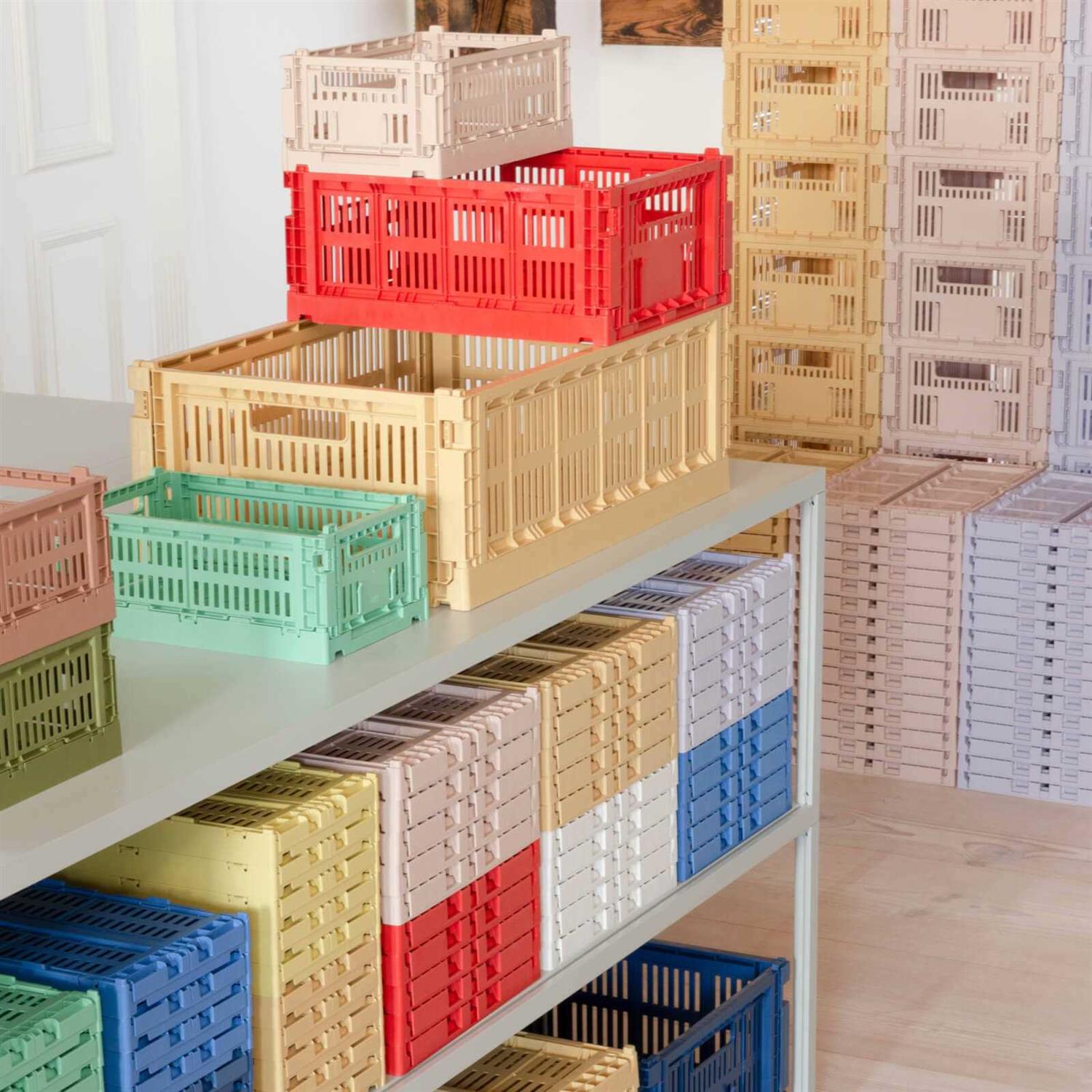 HAY Colour Crates are a series of colourful storage boxes with a distinctive, perforated design. The holes are small enough to stop the contents from falling out, but big enough to allow for good air circulation. Each crate is made from 100% recycled post-consumer plastic waste in a variety of vibrant or sophisticated colours and comes in three sizes. Crates can be stacked on top of one another securely in their various size combinations as widths and lengths are shared. The multifunctional crates are suitable for storing and organising a wide range of items on shelves, tables or inside cupboards. They arrive with you flat packed and are flat packed again in seconds, making them extremely practical to help you move items regularly. Once assembled these lightweight boxes have a super strong construction to help you lift heavy items with ease.