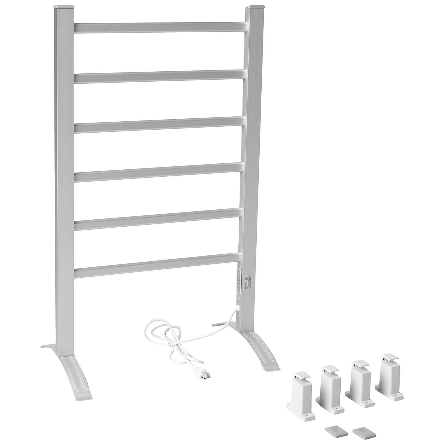 Heat Rails PA002T Towel Warmer Drying Rack with Timer Brushed Chrome Color Nullify Reaches 122 degrees Fahrenheit Uses standard 110-120V outlet Made of lightweight aluminum 6-foot cord Includes two freestanding feet and screws and four wall-mounting brackets, drywall anchors, and screws Enjoy the luxury of a toasty towel with this 6-bar free standing towel warmer. Drape a towel over the six smooth horizontal bars, and they will evenly and quickly heat the towel to a cozy temperature. Beautiful in bathrooms and full of possibilities in the laundry room, exercise room, mudroom or bedroom – either way, it is sure to make life better.