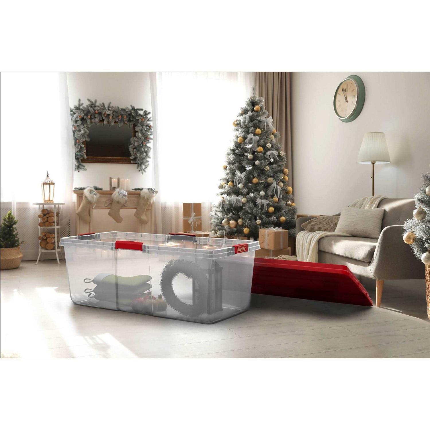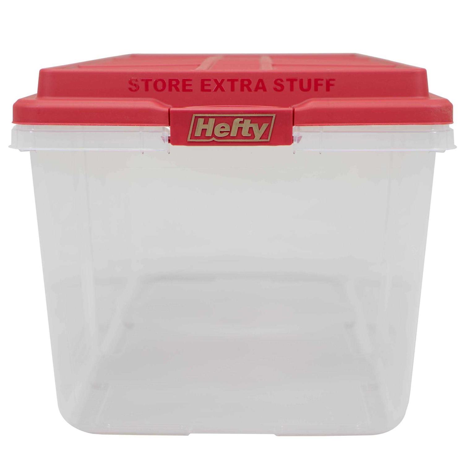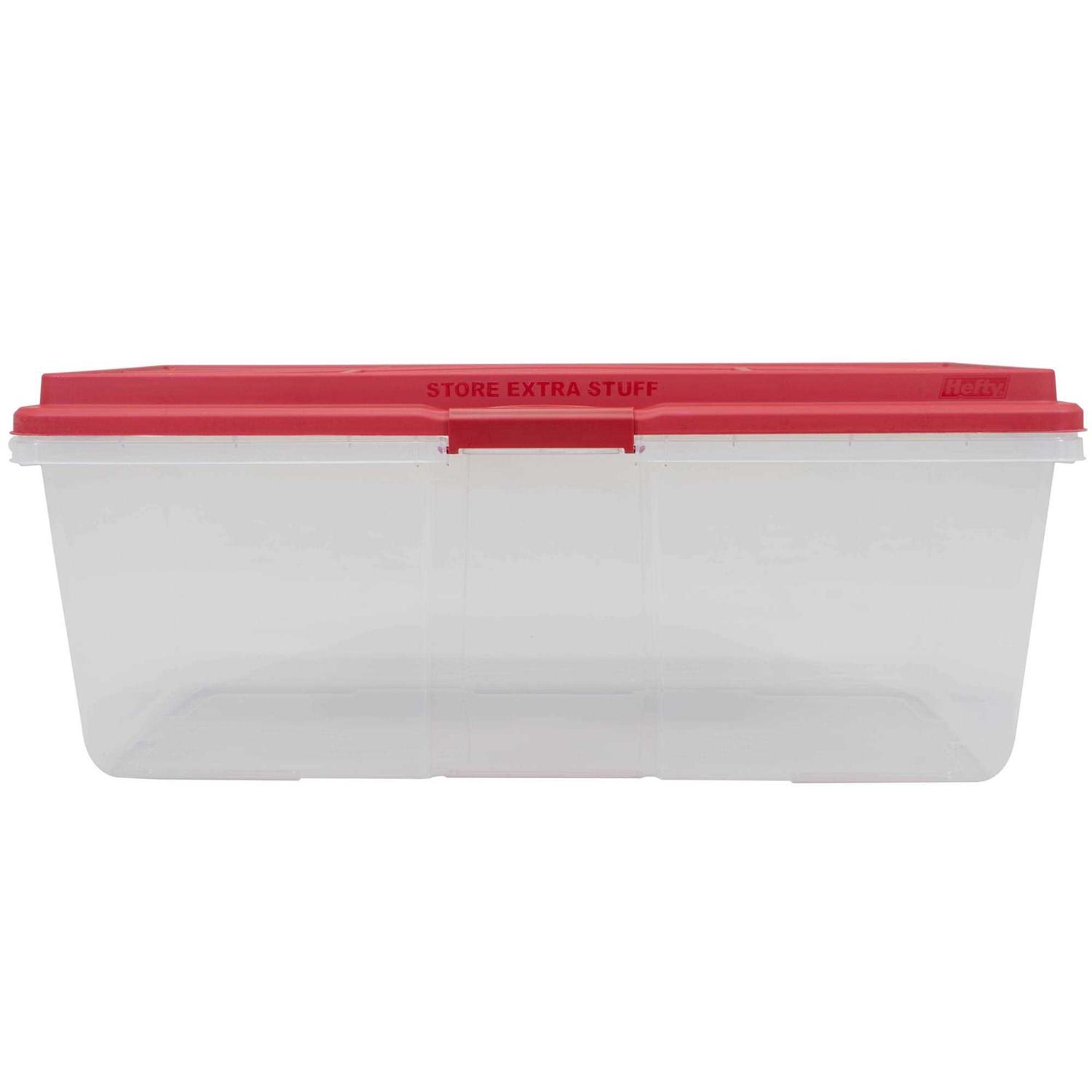 Looking for the perfect storage solution to make organizing the holidays easy? Set apart your holiday decor with the festive Hefty HI-RISE 113 quart storage tote. This clear container with red lid keeps your items dust-free and drive so you can enjoy them for years to come. Stack with confidence on the recessed lid to save space in your garage, basement or attic. The large, click secure latches allow for secure and comfortable transport. Work to maintain your storage space and organize your household with maximum containment. Store and better protect items to SAVE SPACE and edit your home or business.
