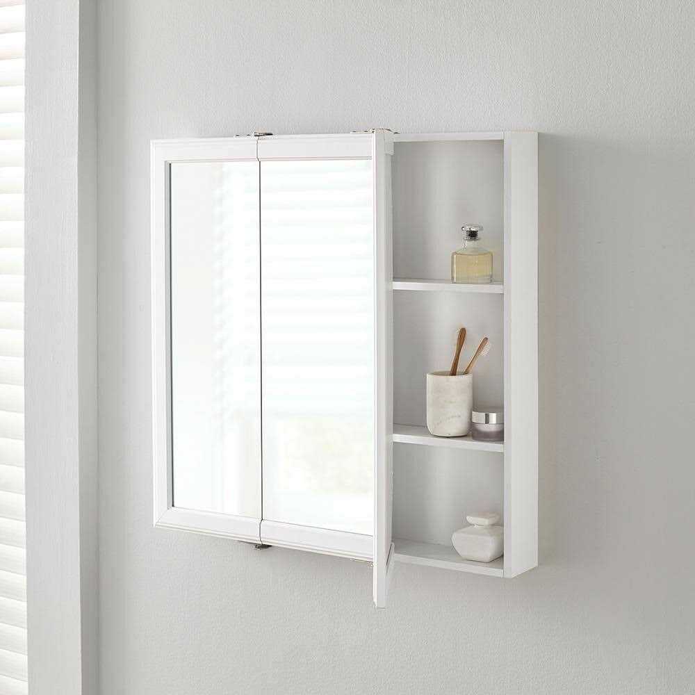 A perfect complement to any bathroom style, the Home Decorators Collections 30 in. W x 29 in. H x 4.57 in. Enjoy a fogless reflection without wiping off your mirror or having to use a hairdryer to remove steam. The tri-view mirror offers multiple viewing angles for added functionality. The 2 adjustable shelves offers ample storage flexibility. Double shelf pegs enable you to customize your space quick and easy. Wood Composite construction provides exceptional durability and strength. Fully assembled for your convenience.