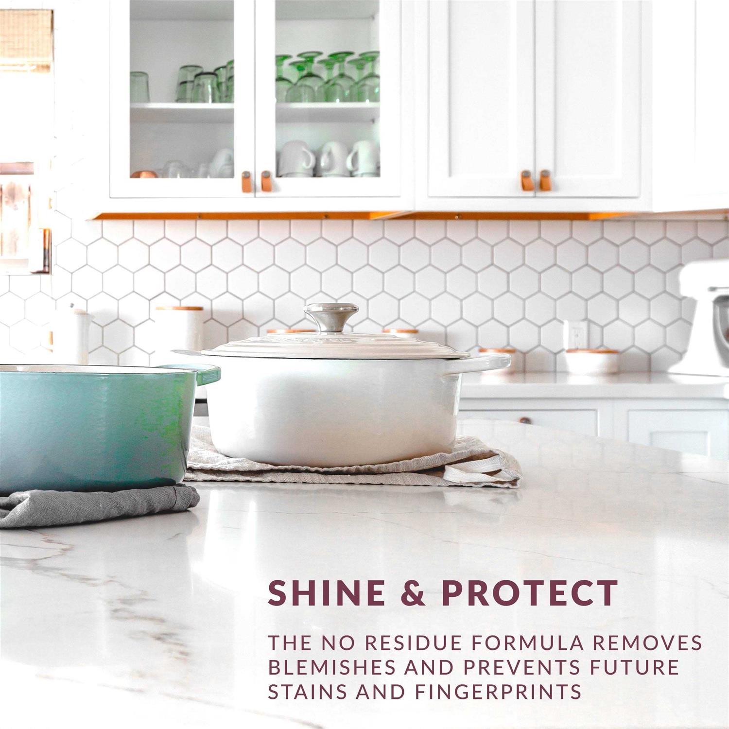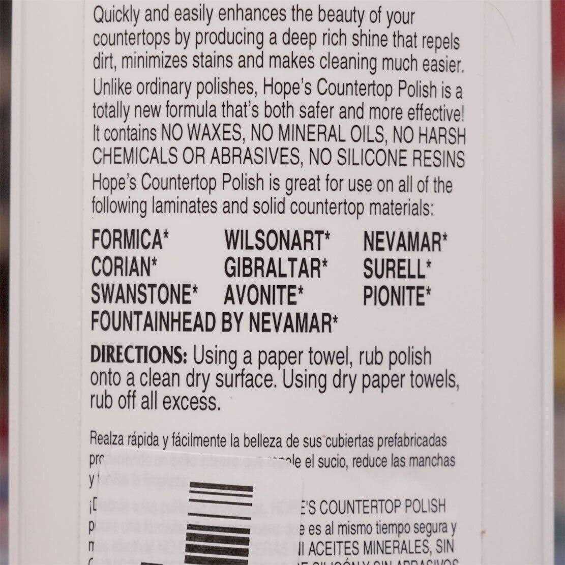 Hopes Premium Countertop Polish is a unique formulation that cleans, beautifies, and minimizes fingerprints. Make your countertops shine like new without leaving residue behind with the nontoxic, wax-free solution. This polish works hard to keep your countertops in peak condition by mitigating future stains with a protective coating. Simply wipe the polish on and off; there is no need to use additional tools, towels, or rags to buff or complete the shine. Keep your family safe and your kitchen smelling fresh with this polish that is made without any harsh chemicals and scented with only natural fragrances. This polish delivers premium results on almost any surface, including granite, marble, quartz, composite, or Corian; it is recommended by top manufacturers such as DuPont. Use Hopes Countertop polish on new surfaces to preserve their shine, or give new life and a glossy smooth finish to rough, damaged, or badly stained surfaces. This polish will save you money by restoring old counters that would otherwise need to be replaced. Hopes Premium Countertop Polish is a powerful solution that brings life to all countertops whether they are new or old, shiny or dull, smooth or damaged.