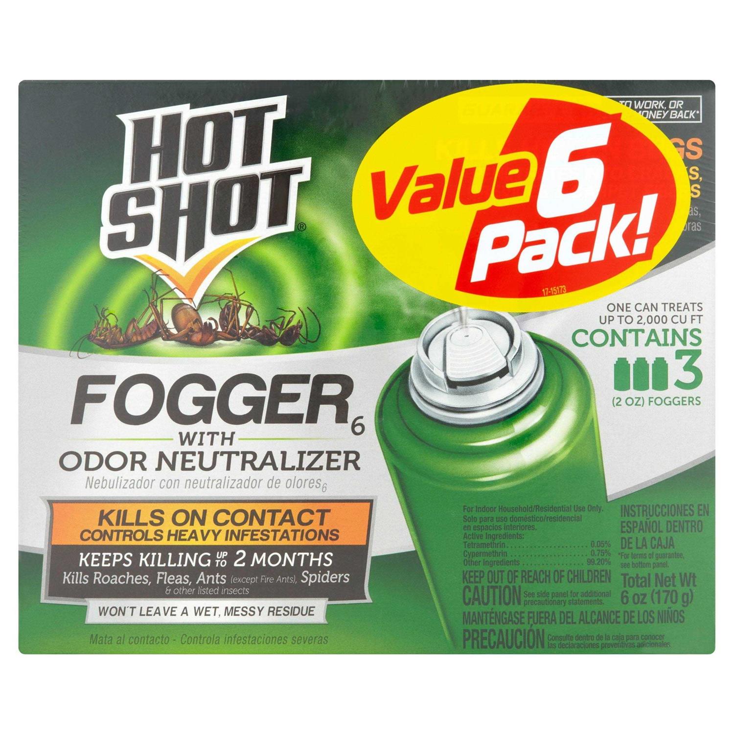 Hot Shot Fogger With Odor Neutralizer creates a ne, penetrating mist that reaches deep into cracks and crevices to ush out and kill hidden bugs on contact. This product kills ants (except fire ants), black carpet beetles, brown dog ticks, crickets, earwigs, firebrats, fleas, flies, gnats, houseflies, mosquitoes, palmetto bugs, pillbugs, rice weevils, roaches, saw toothed grain beetles, silverfish, small flying moths, spiders and waterbugs. Does not control bed bugs. When used as directed, the clear, non-staining formula will not harm drapes, upholstery, fabrics, carpeting, bedspreads, oor tiles, wood oors, linens, furniture, walls, clothing, ceilings, shades or blinds. Hot Shot Fogger With Odor Neutralizer kills both ying and crawling insects on contact and keeps killing for up to 2 months without leaving a wet residue. One can of this product treats up to 2,000 cubic feet of unobstructed space. Read and follow all label directions before using this product.