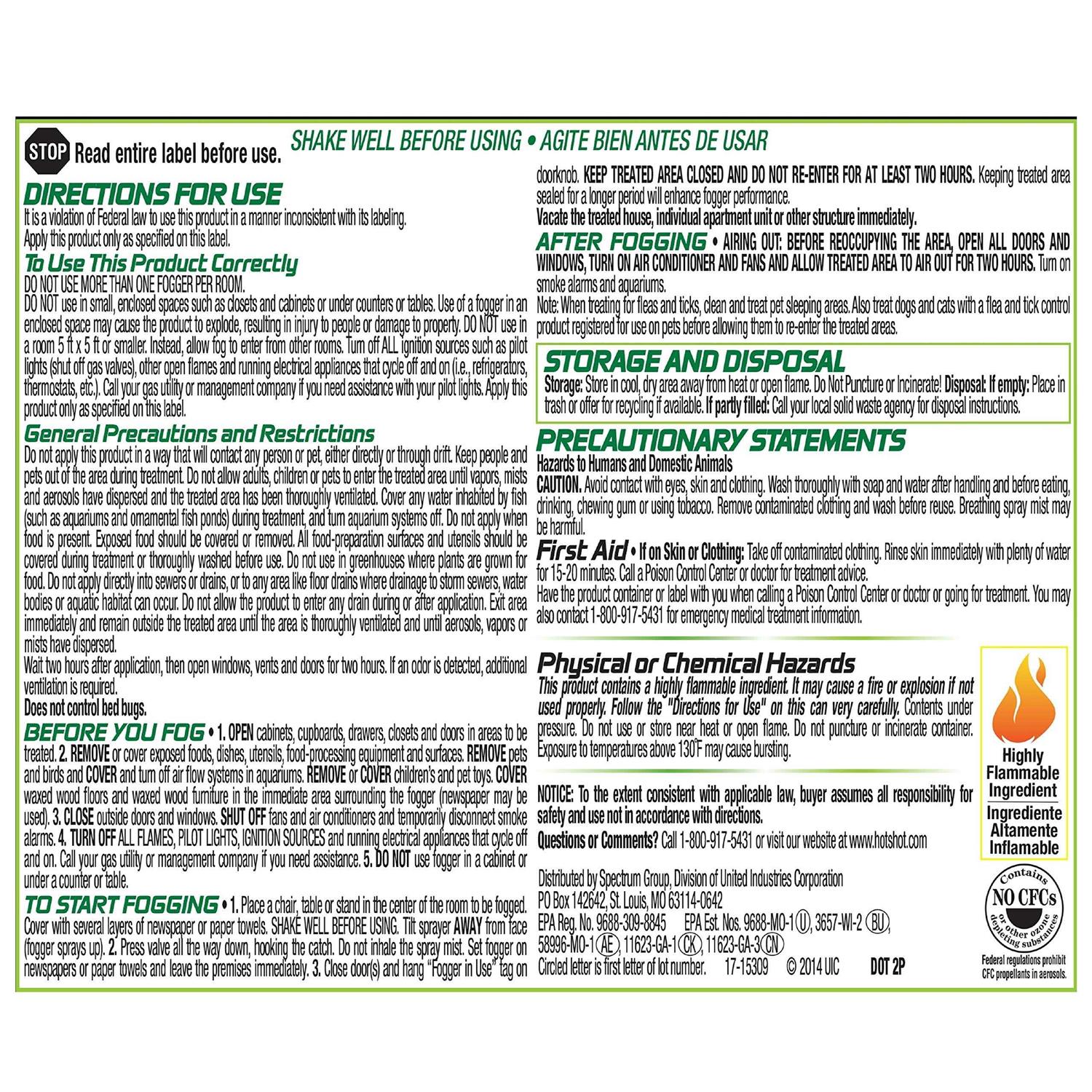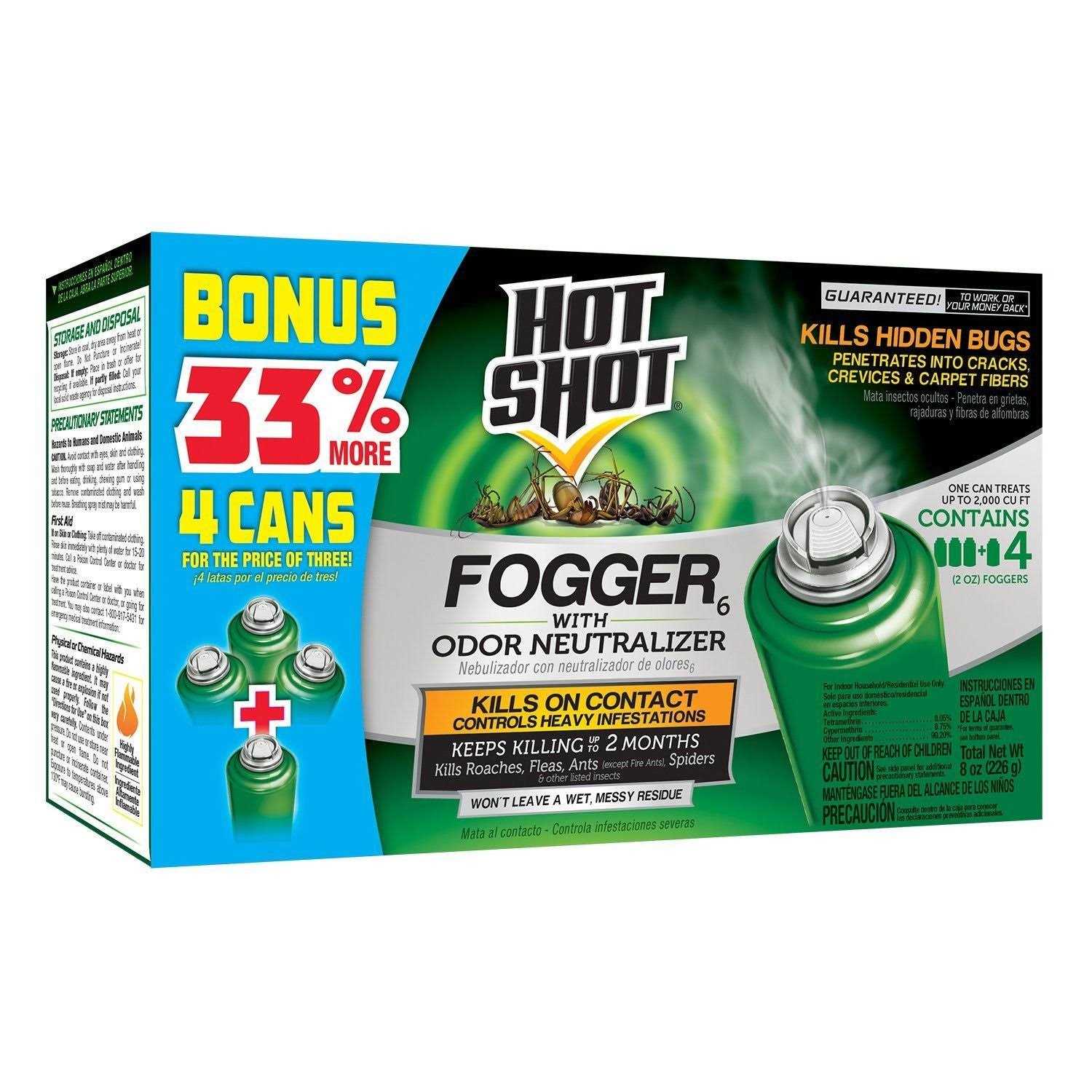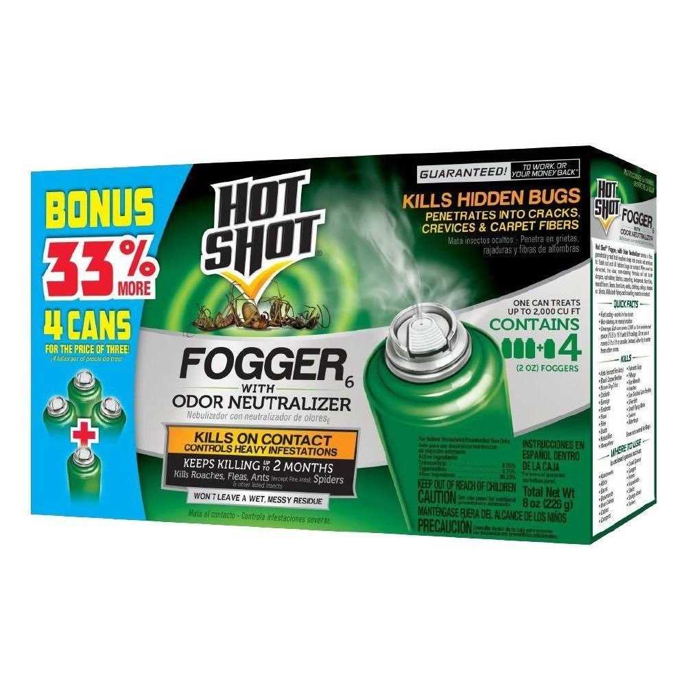 Between the carpool and the couch cushions, youre the CEO of the home front. Take care of your family – and take care of business, no matter where household pests rear their ugly heads. Show bugs whos boss with Hot Shot insecticides. Theyre your weapon of choice, giving you the clear advantage within your walls and at the bank. Save the day. Hot Shot Fogger6 With Odor Neutralizer creates a ne, penetrating mist that reaches deep into cracks and crevices to ush out and kill hidden bugs on contact. This product kills ants (except fire ants), black carpet beetles, brown dog ticks, crickets, earwigs, firebrats, fleas, flies, gnats, houseflies, mosquitoes, palmetto bugs, pillbugs, rice weevils, roaches, saw toothed grain beetles, silverfish, small flying moths, spiders and waterbugs. Does not control bed bugs. When used as directed, the clear, non-staining formula will not harm drapes, upholstery, fabrics, carpeting, bedspreads, oor tiles, wood oors, linens, furniture, walls, clothing, ceilings, shades or blinds. Hot Shot Fogger6 With Odor Neutralizer kills both ying and crawling insects on contact and keeps killing for up to 2 months without leaving a wet residue. One can of this product treats up to 2,000 cubic feet of unobstructed space. Read and follow all label directions before using this product. When creepy bugs attempt to pass, save the day with Hot Shot insecticides.