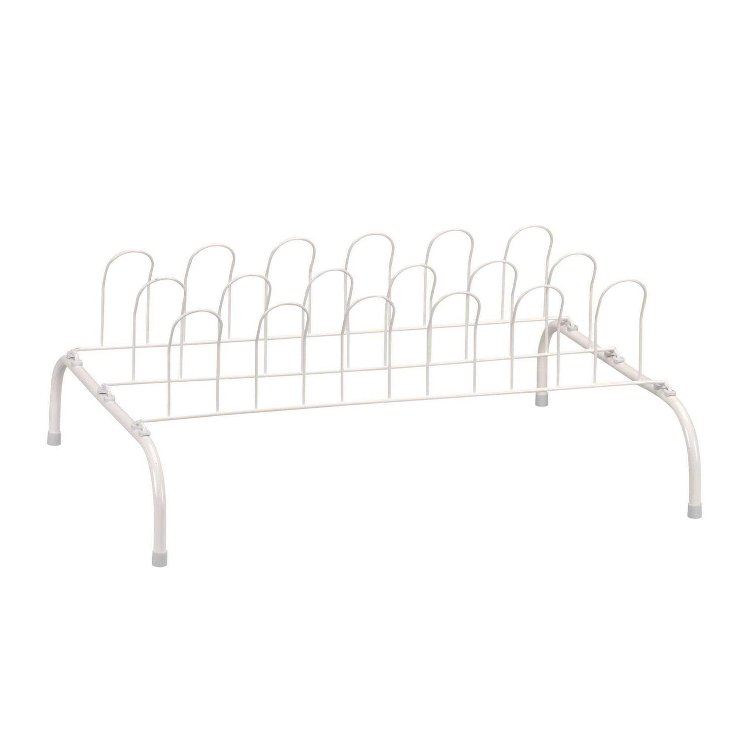 Optimize space in smaller, cluttered or stuffed closets with this short wire shoe rack. Its unique profile takes advantage of space below long coats or dresses, and the durable materials promise to last through many seasons and shoe collections. This compact shoe rack is made of powder-coated steel with protective plastic foot caps. The durable frame provides the needed support and space to hold an abundance of 9 pairs of shoes. To fit easily underneath hanging clothes or fabric shelves, this rack stores footwear vertically and has a wide base but a short stature. No need to fumble with low-hanging slacks, dresses, coats or other clothing to reach your favorite heels! Each of the 3 rows has 6 arches. These arches smoothly fit into the toe of your heels, slippers, tennis shoes or loafers. Their slightly angled tops also help secure the shoe and prevent slippage. This wire shoe rack is super easy to put together. No tools are required and each piece clicks together to form the sturdy frame. Anyone who struggles to find space in their closet to organize their footwear would benefit from this chic wire shoe rack. Its white powder-coat grants extra resilience and can pair with any room style.