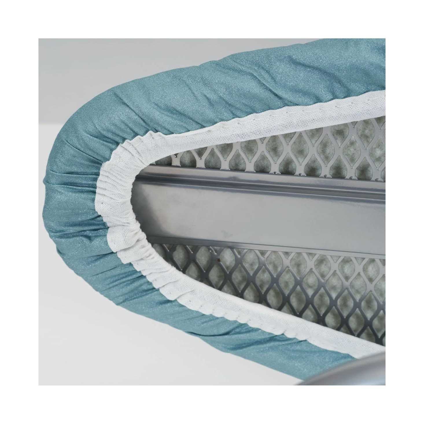 Specially cut to fit the TABLE TOP boards, this 100% cotton cover and 4mm fiber pad, with its one-piece solid construction and resilient, matte-free surface, make ironing smoother and easier. An attached pocket holds your starch and spray bottles close at hand, enhancing your efficiency. The tailored design and bungee cord binding ensures a tight fit, so your cover stays secure. Its classic blue silicone coated finish helps your cover remain stain and scorch resistant, so you can iron worry-free, confident that your board and clothes will last, keeping you and your board looking good! Tailored design and bungee cord binding secures fit. Silicone coated for stain resistance and durability. Dimensions: 12.5 W x 30 to 33 L.