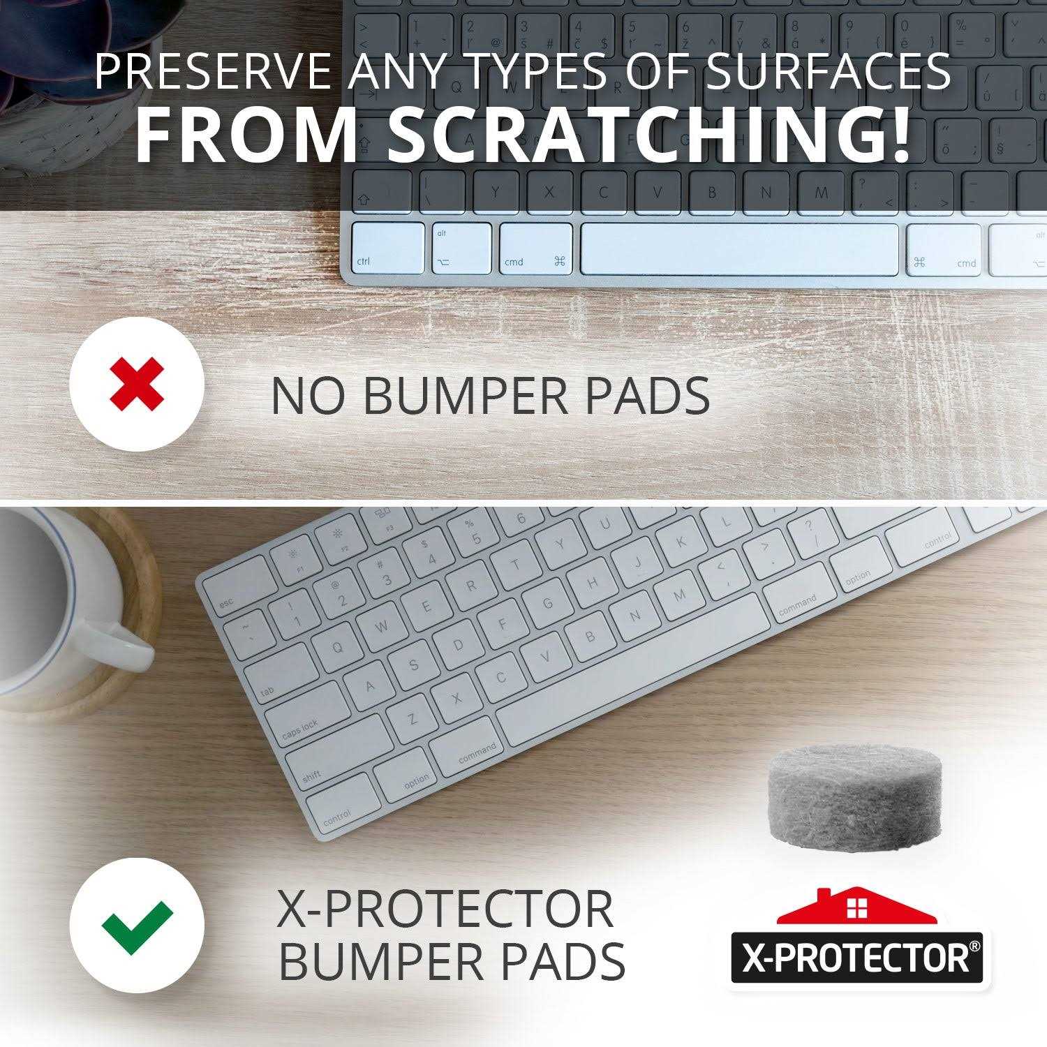 X-Protector Bumpers are made of high-quality and 1/5” thickness felt. Felt pads for cabinet doors will stay put on any surface for a long time! The big pack of Felt Pads includes 100 pcs of 3/8” sound-dampening door bumpers. Materials: strong eco-friendly felt material with recycled fiber with tenacious adhesive.