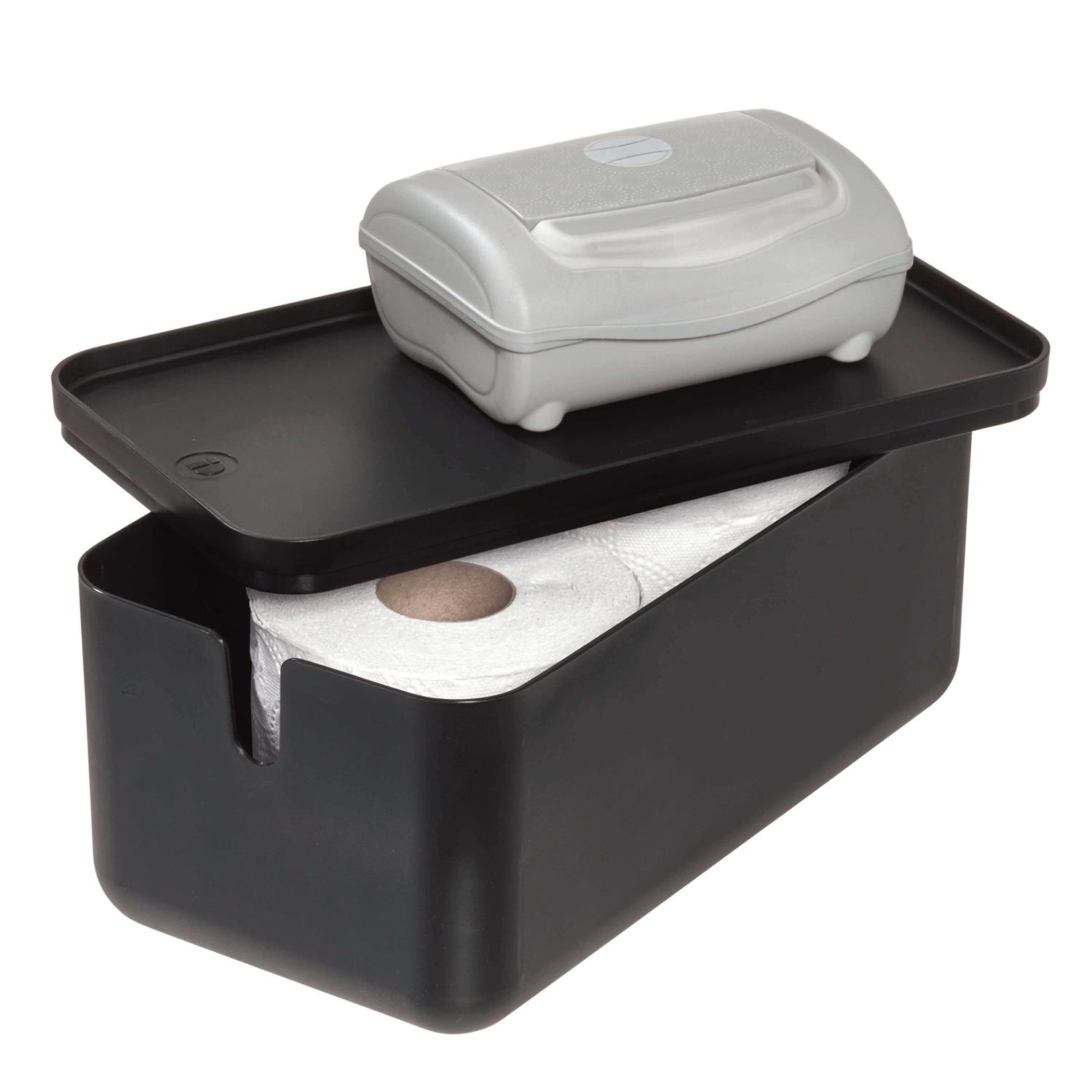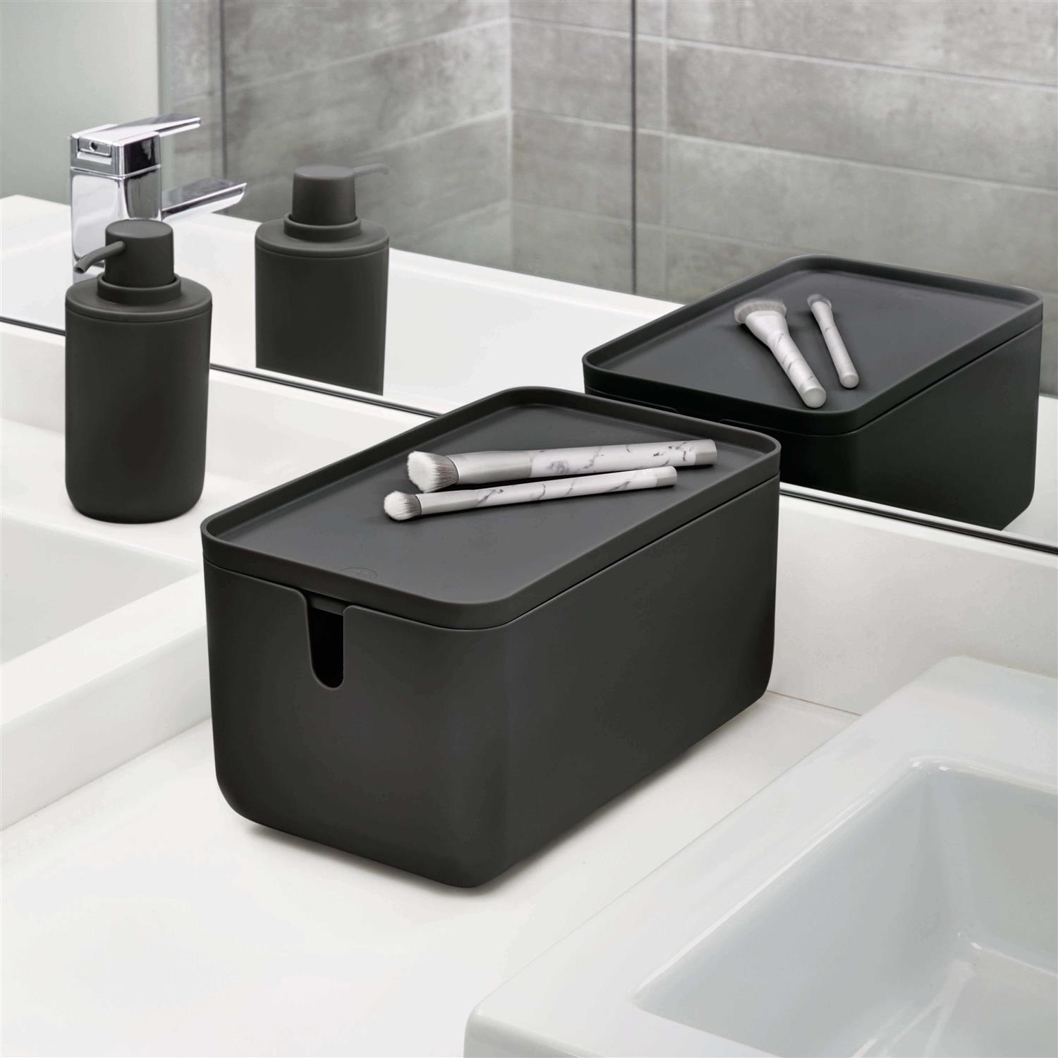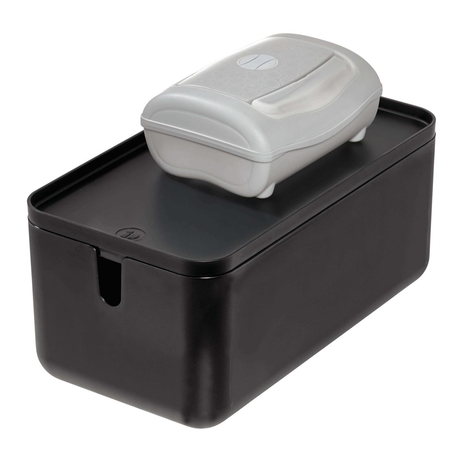 Organize your bathroom in style with the iDesign Cade Toilet Paper Storage Bin with Lid. This toilet paper roll reserve can hold up to two extra rolls of toilet paper, including standard, mega, and jumbo-sized rolls, and it can be stacked with additional bins (sold separately) for modular storage. Designed with versatility in mind, it can be used next to the toilet, on top of the tank, or in bathroom cabinets and closets, and the non-skid feet help keep it in place. The removable lid keeps toilet paper clean and dry until ready for use, while the raised edge of the lid provides storage space for cleaning wipes, sprays, or phones. Featuring a modern design and sleek black color, this toilet paper holder complements a variety of bathroom decor styles. The durable BPA-free plastic construction is rustproof and stands up to every day use. Measuring 11.88″ x 6.38″ x 5.75″, the slim-profile design makes it perfect for adding extra storage in compact spaces in the bathroom. With iDesign by InterDesign, you can #LiveSimply every day.