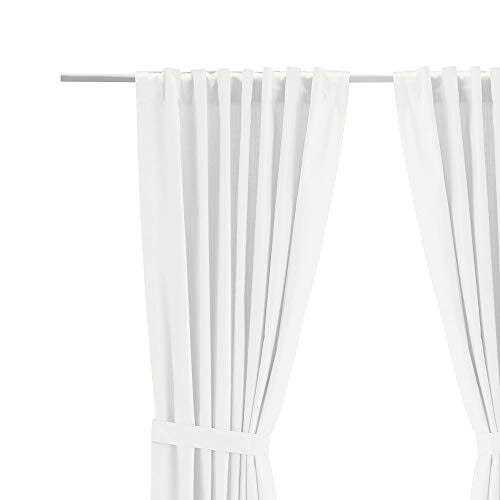 The curtains lower the general light level and provide privacy by preventing people outside from seeing directly into the room. The curtains can be used on a curtain rod or a curtain track. The heading tape makes it easy for you to create pleats using RIKTIG curtain hooks (Hooks sold separately). You can hang the curtains on a curtain rod through the hidden tabs or with rings and hooks. Good to know Contains 2 panels with tie-backs. The measurement applies to each curtain panel. Care instructions Machine wash very hot normal cycle. Do not bleach Tumble dry medium normal cycle Iron high Do not dry clean Shrinkage 4%.