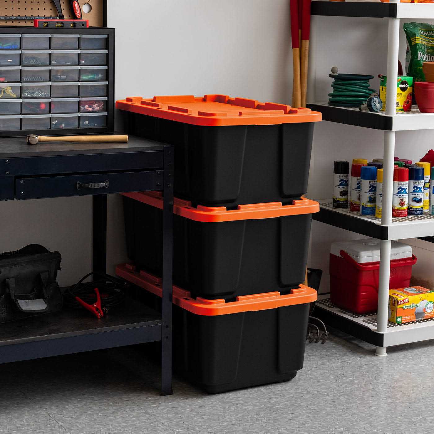 Take toughness to another level. These IRIS USA Halloween color heavy duty Utility Tough Totes made of durable plastic help keep contents safe and secure. Plastic boxes hold up to 27 gallons, offering ample storage space inside. Uniquely designed lock holes in the lid and rim make it easy to secure the lid in place with a padlock or with a bungee cord, letting you add an extra level of safety to your plastic storage unit. The grooves in the lid make it easy to secure straps or bungee cords, letting you quickly secure multiple plastic bins in place. The non-slip nesting lid makes stacking multiple plastic storage boxes quick and secure, maximizing limited storage space and helping you meet any large storage need.