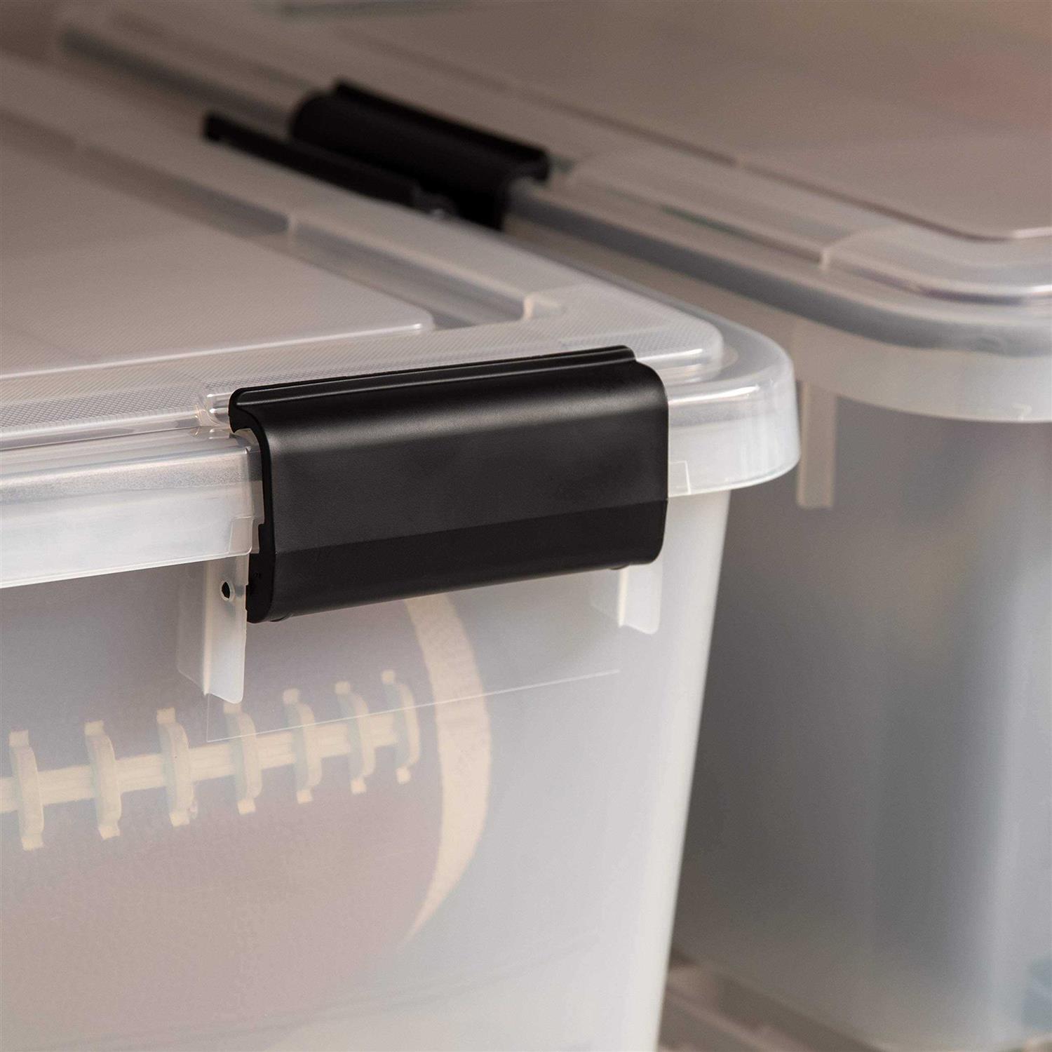 Store your favorite keepsakes and other large valuables in this WEATHERTIGHT heavy-duty storage tote. The WEATHERTIGHT seal on the storage bin lid protects contents by keeping air and moisture out. Safely store crafting supplies, camping gear, board games or linens in these big storage bins. The grooves in the reinforced lids means these stackable totes with lids can be placed on top the other totes to save space.