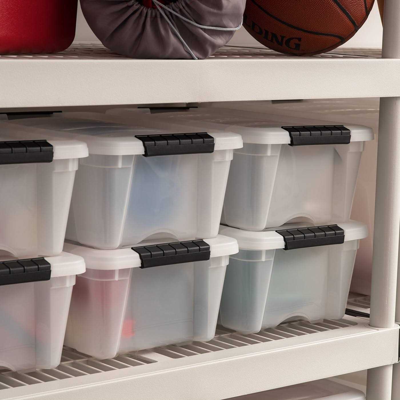 - Built-in handle on 12 qt. storage totes for easy removal from shelves.
