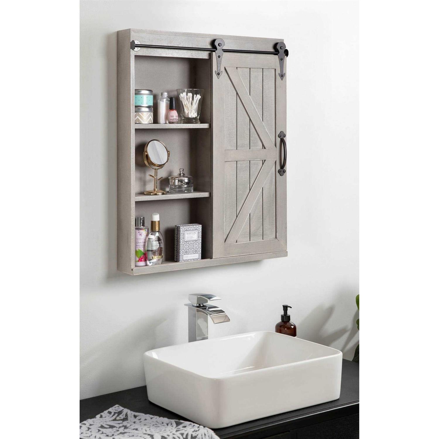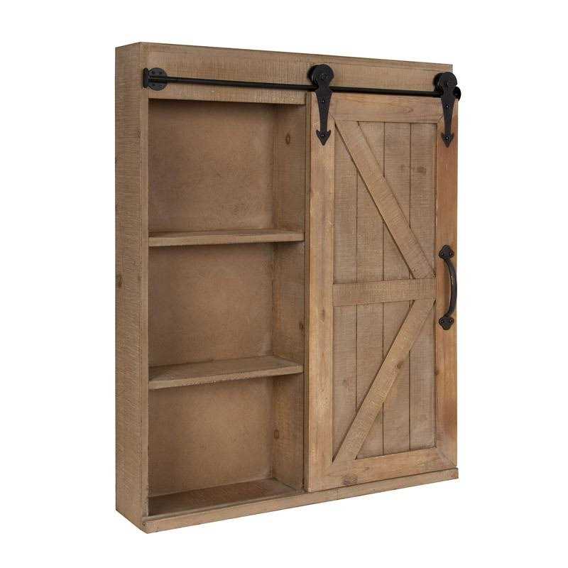 Decorate your home in vintage farmhouse style with this unique hanging wall shelf with inset mirror and sliding barn door. Newly designed to include a panel mirror on one side within the cabinet, this clever unit has lots of functionality to organize in a big way without using a lot of space. Itll work exceptionally well in a powder room as a unique vanity but it would also look and function great in an entryway, mudroom, kitchen, or bedroom. The left half of this cabinet has three shelves at 10 inches wide by 7.75 inches tall and 3.75 inches deep to store items of different sizes. The mirror is secured to the back wall of the right half of the cabinet and measures 9.5 inches wide by 24 inches tall. There is a small 3.5-inch deep shelf in front of the mirror. The single barn door slides to cover either side and has a groove at the bottom it sits in so it doesnt swing. The outer dimensions of this wall shelving unit are 21.75 inches wide, 27.75 inches high, and 5 inches deep. Two metal Z-brackets are inset on the back of the cabinet for a simple, secure wall display. This wall cabinet arrives completely assembled ready to use.