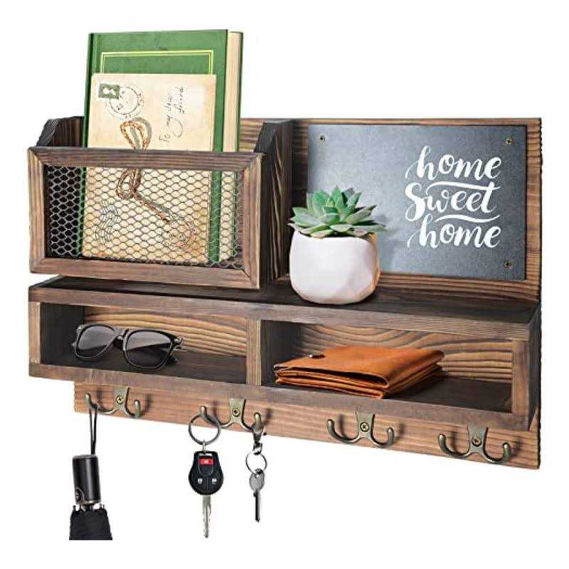 Quality Pine Wood That Last key holder for wall is made of quality and strong pine wood and 4 sturdy metal double key hooks, that make the key and mail holder hold up to 20 lbs without warping, bending or splintering. Multiple Storage Shelves This organizer wall-mounted key holder integrates 4 double-sided key hooks, mail organizer, chalkboard sticky note and 2 storage box. You can use the hanging organizer to hold keys, mail, wallets, sunglasses, hats, umbrellas, and more. This way you won’t lose your keys and mail in the chaos as a result. Stylish Looking Mail Holder You can install a key mail organizer wall mount in the front door, hallway, living room, bedroom, bathroom, or farmhouse Storage room to meet all of your storage needs while also decorating your home. Small Blackboard There is a small On the right side of the key rack. You can use it as a note, such as “Don’t forget to bring keys”, or wite some words “Home Sweet Home” to add a warm family atmosphere. Keyhole Mounting Brackets The WEWEOW key rack and mail organizer comes with everything you need to get started, including drywall anchors and screws. The key rack for the wall measures 15.7″” wide x 10.2″” high x 3.3″” deep and can hold groceries. Ideal for use as a key holder, mail/wallet/umbrella/sunglasses organizer, or as a gift idea.