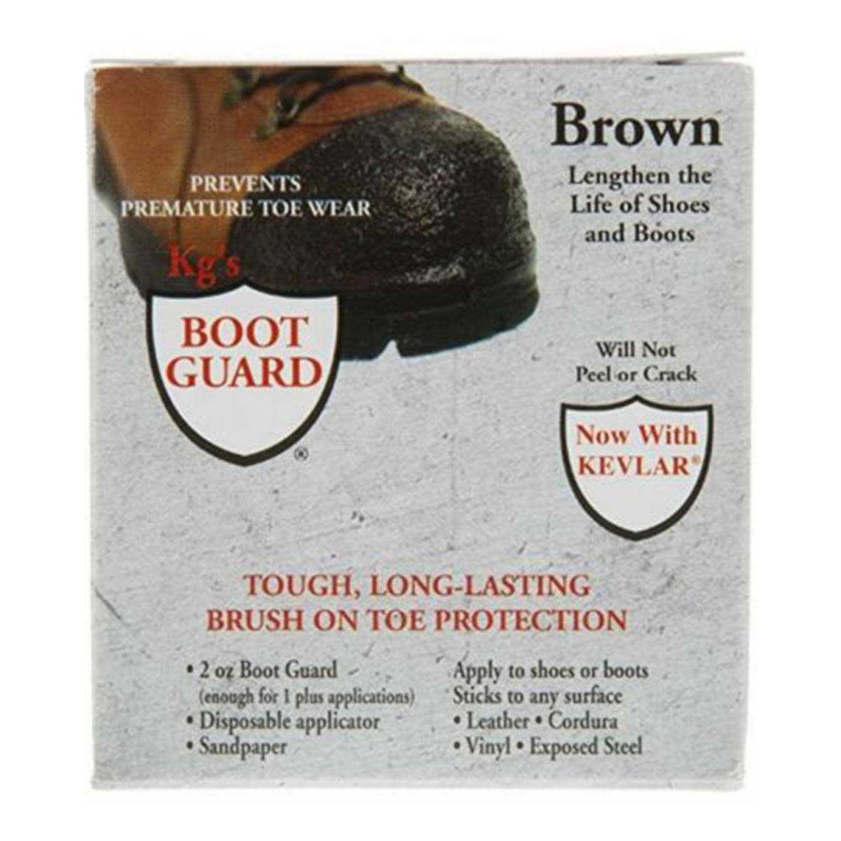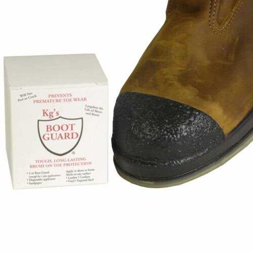 Get more mileage out of your workboots. Kg’s Boot Guard offers superior protection from toe wear, water seepage along the welt, and seam erosion. The boot guard can be applied to new or used boots and bonds to leather, rubber, Cordura, vinyl, and even to exposed steel.Kg’s Boot Guard is tough and permanent! It will not crack, peel, or flake off. Simply brush on the first coat, let dry for two hours, brush on one last coat, and dry overnight. The applicator can be cleaned with mineral spirits for reuse.Each jar typically contains enough coverage for at least three boot applications.