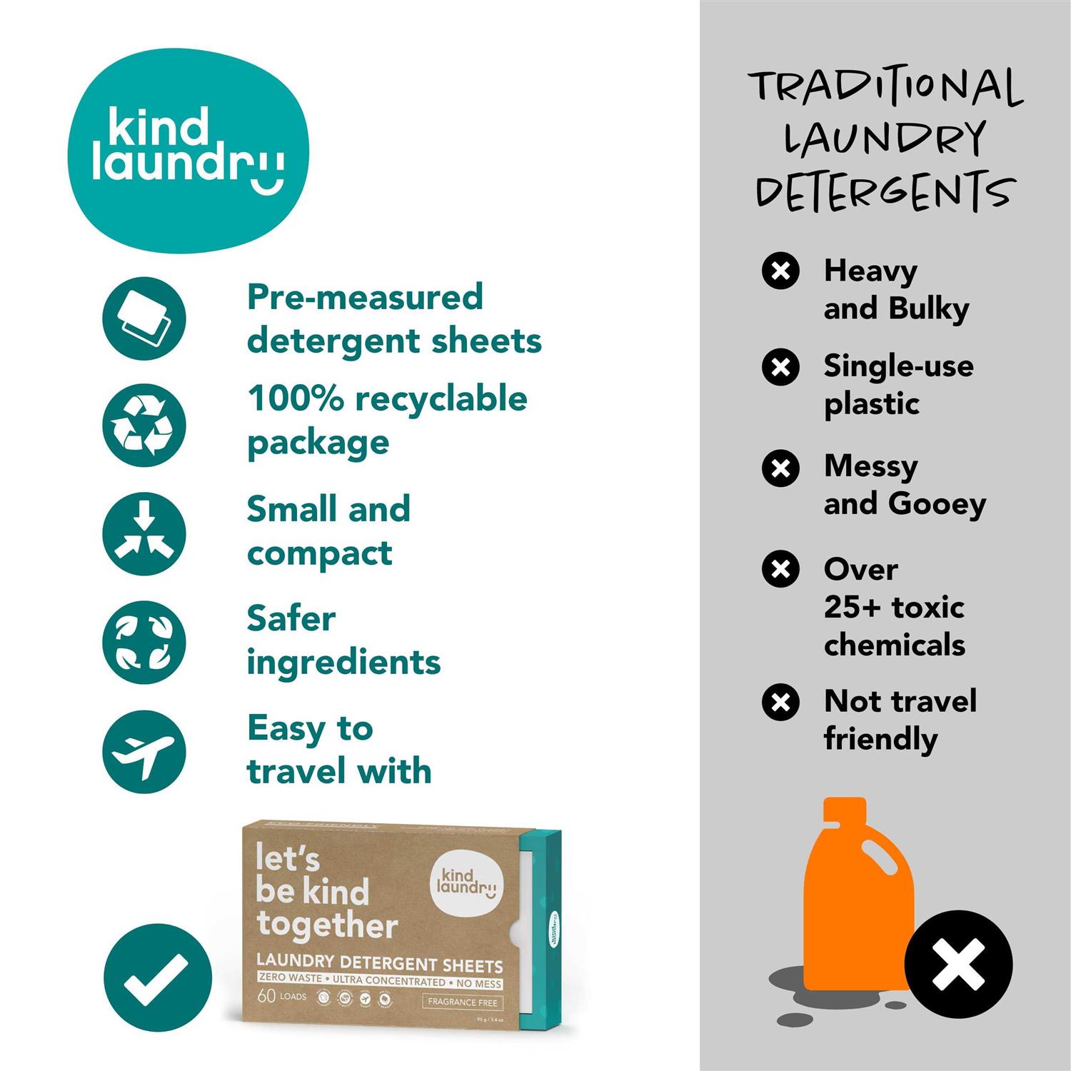 Made with zero-waste packaging, our detergent sheets contain no harsh chemicals, yet still harness strong cleaning power. You’ll LOVE this product because it can help make a difference to the planet, protect your family, and make laundry less of a chore. Here is what makes Kind Laundry so unique: 1. Helps reduce plastic waste to landfills (close to 1 billion laundry jugs goes to landfills and oceans in the US, alone) 2. Helps reduce the number of toxic chemicals their family are exposed to (there are 25+ toxic chemicals in traditional liquid laundry detergents, some of which are banned in the EU and Canada but not in the US) 3. No more mess. No more waste. Save space (our detergent sheets are pre-measured and packed in a recyclable compact box – yay to more storage room)! 4. Easy to travel with (its liquidness and weightless form make it easy to squeeze in a carry-on and no more hassle at customs).