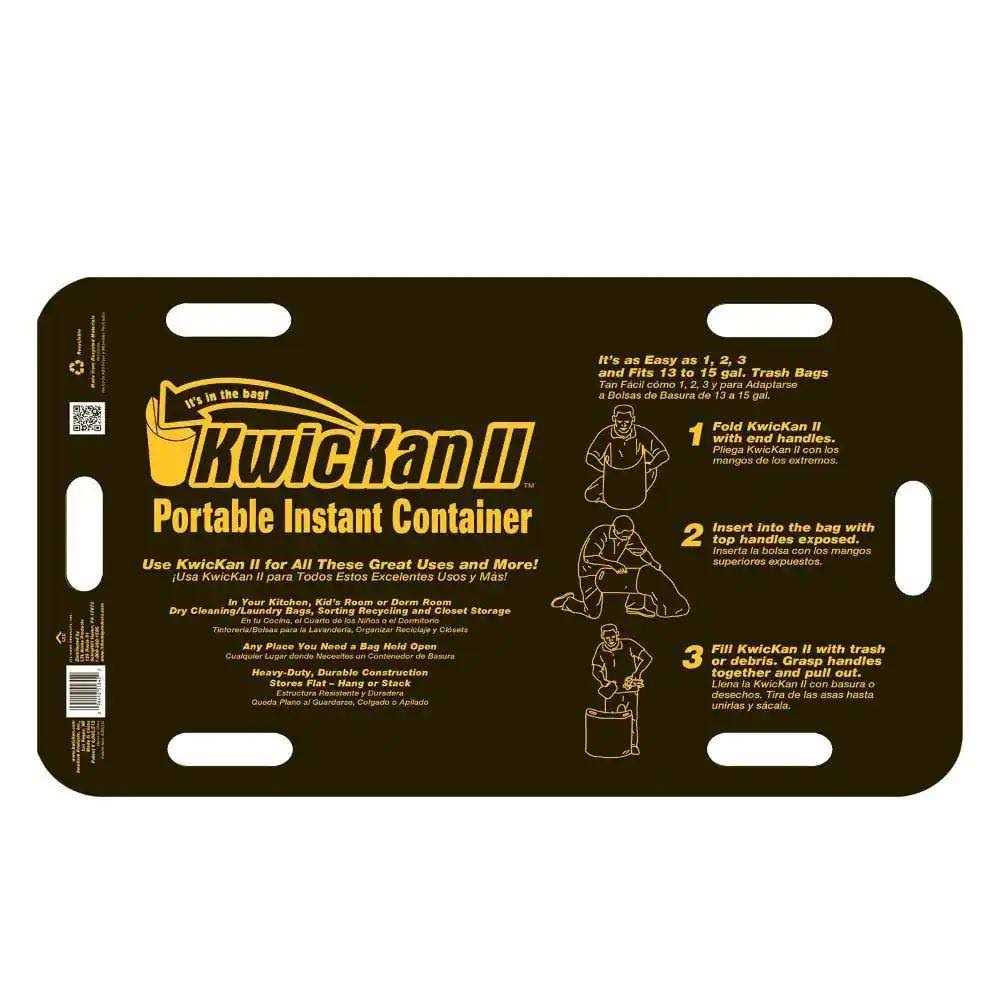 KwicKan II is a lightweight, extremely portable and reusable bag holder. Stores flat and will hold open 13 Gal. (U.S.) plastic and paper garbage bags. KwicKan is perfect for residential use and is durable enough for commercial projects. The product is constructed from virgin and recycled acrylonitrile butadiene styrene (ABS) plastic. Clean up yard and construction projects faster with a stable trash collection platform that also limits bag tears.