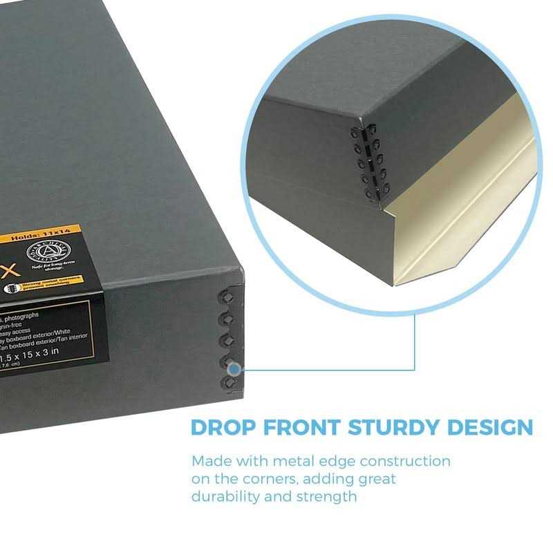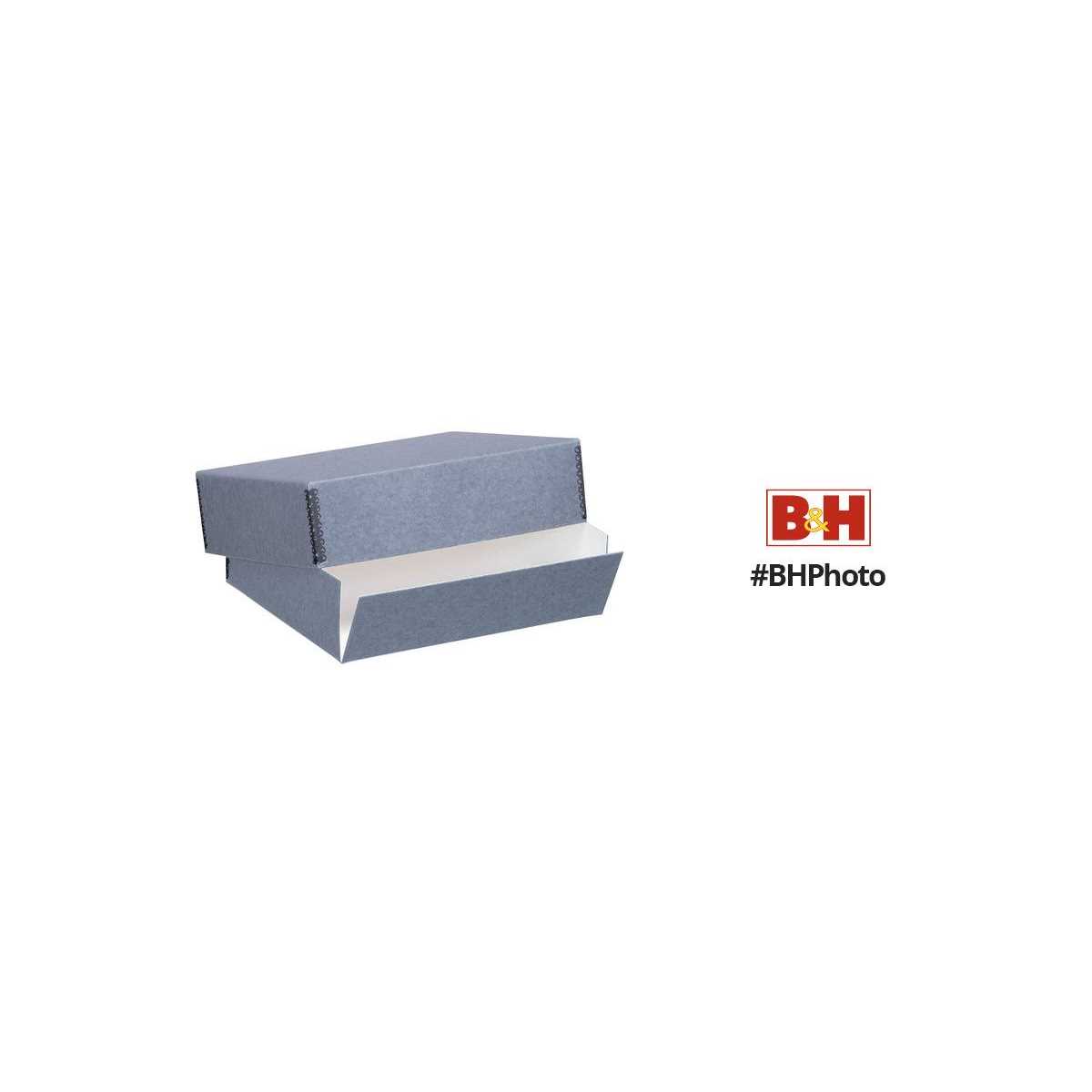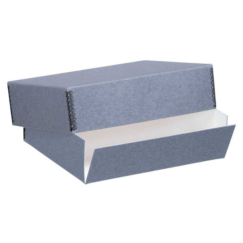 This blue/gray 11.5 x 15 x 3″ Drop-Front Archival Box from Lineco is used by photographers, artists, and archivists for storing and protecting photographs, flat art, and other important documents. The archival box is made from a 60-point board, which is acid- and lignin-free, making the box suitable for long-term storage. Acid levels are lowered because the board is buffered and does not transfer any contamination to the contents. Each corner of the lid and box has a metal edge for added strength and durability, which is ideal for stacking boxes on top of each other. Once the lid is removed, the box’s drop-front lowers to reveal a white interior, that allows easy access without any damage to the contents.