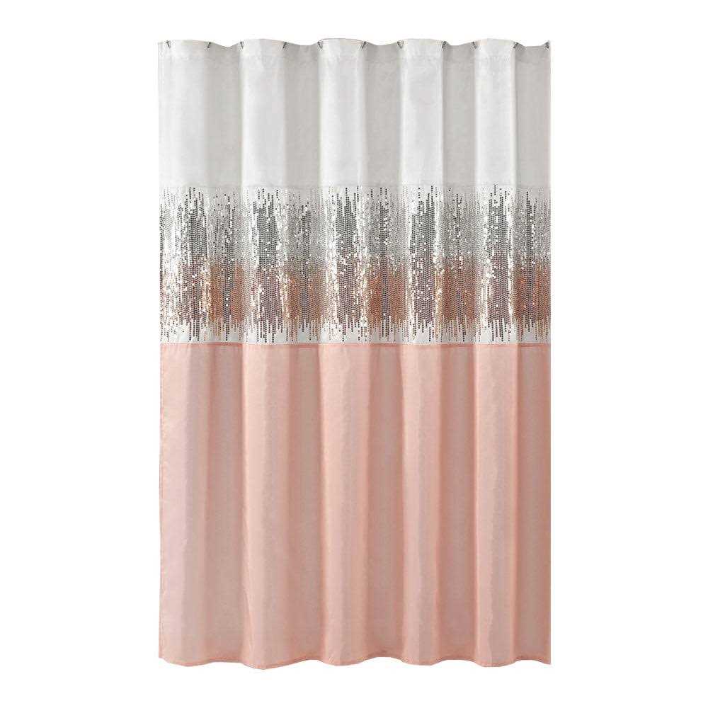 • Bold fabric shower curtain with a shimmery, sequin panel for an eye-catching design.