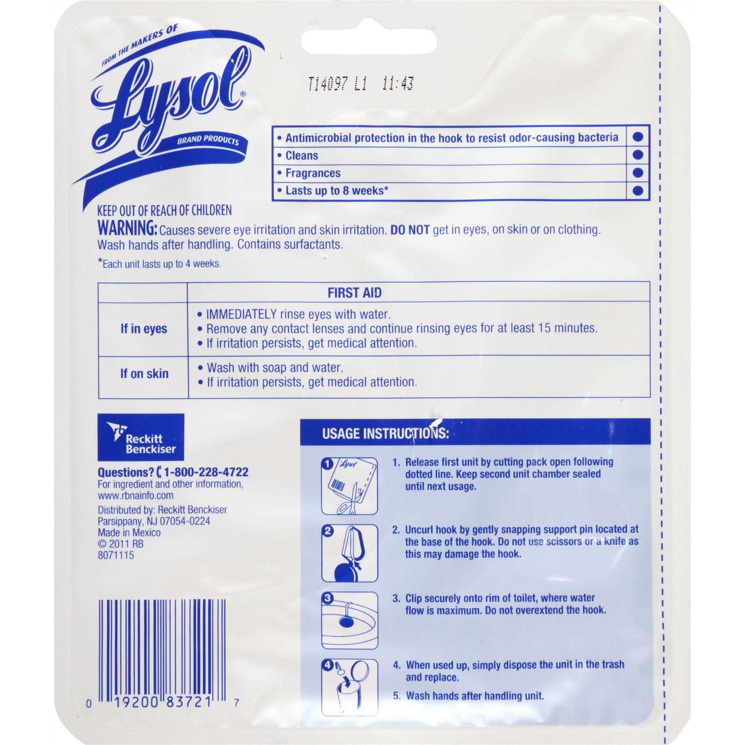 Lysol Hygienic Automatic Toilet Bowl Cleaner hangs on the inside of the toilet bowl to help you maintain a Complete Clean between deep cleaning your toilet bowl. It not only cleans your toilet bowl with every flush, but it also freshens your entire bathroom. They last for up to 8 weeks and are easy to use. It contains antimicrobial protection in the hook to resist odor-causing bacteria.