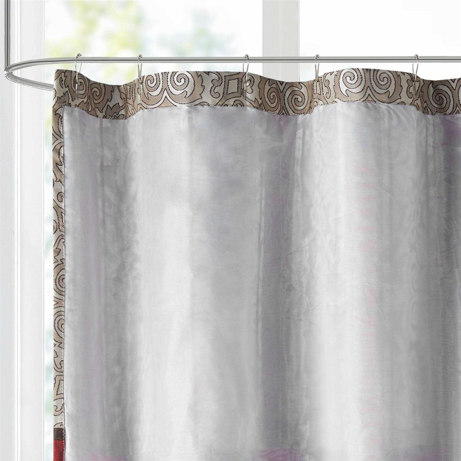 Add a touch of sophistication and elegance to your bathroom with the Donovan shower curtain. This stunning curtain features a bold color-blocked design that is accentuated with intricate embroidery details. The jacquard weave adds depth and texture to the curtain, showcasing a beautiful medallion pattern that gives an entirely new look to your bathroom decor. This collection also features coordinating bedding that is sold separately, allowing you to create a cohesive and stylish look throughout your entire bedroom and bathroom.
