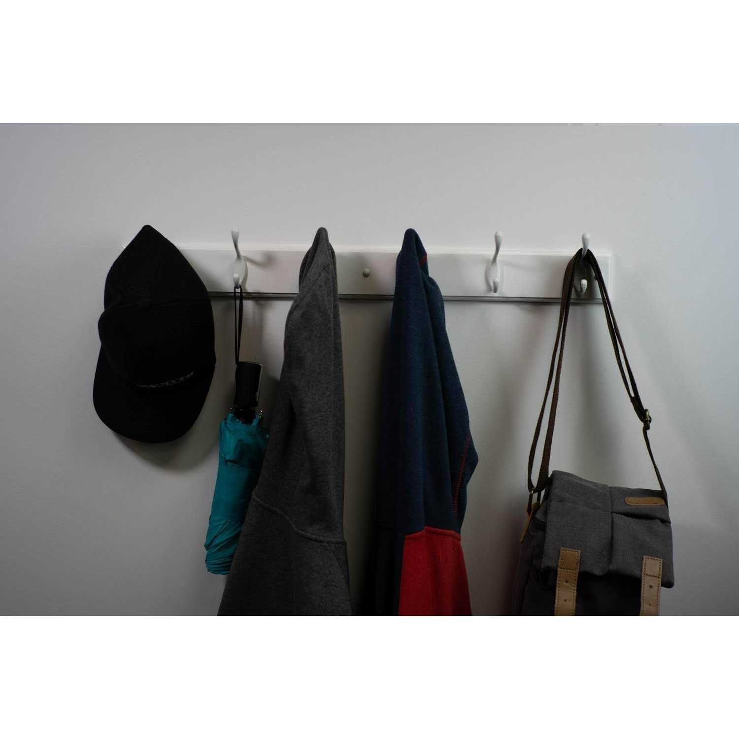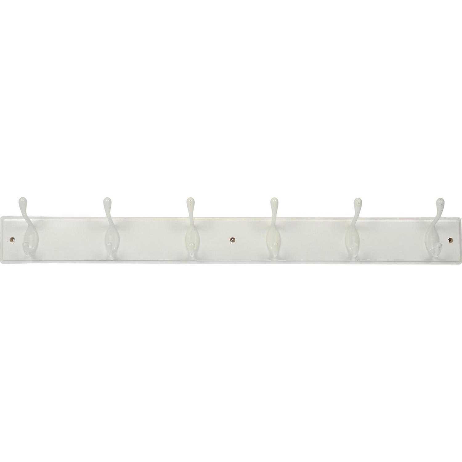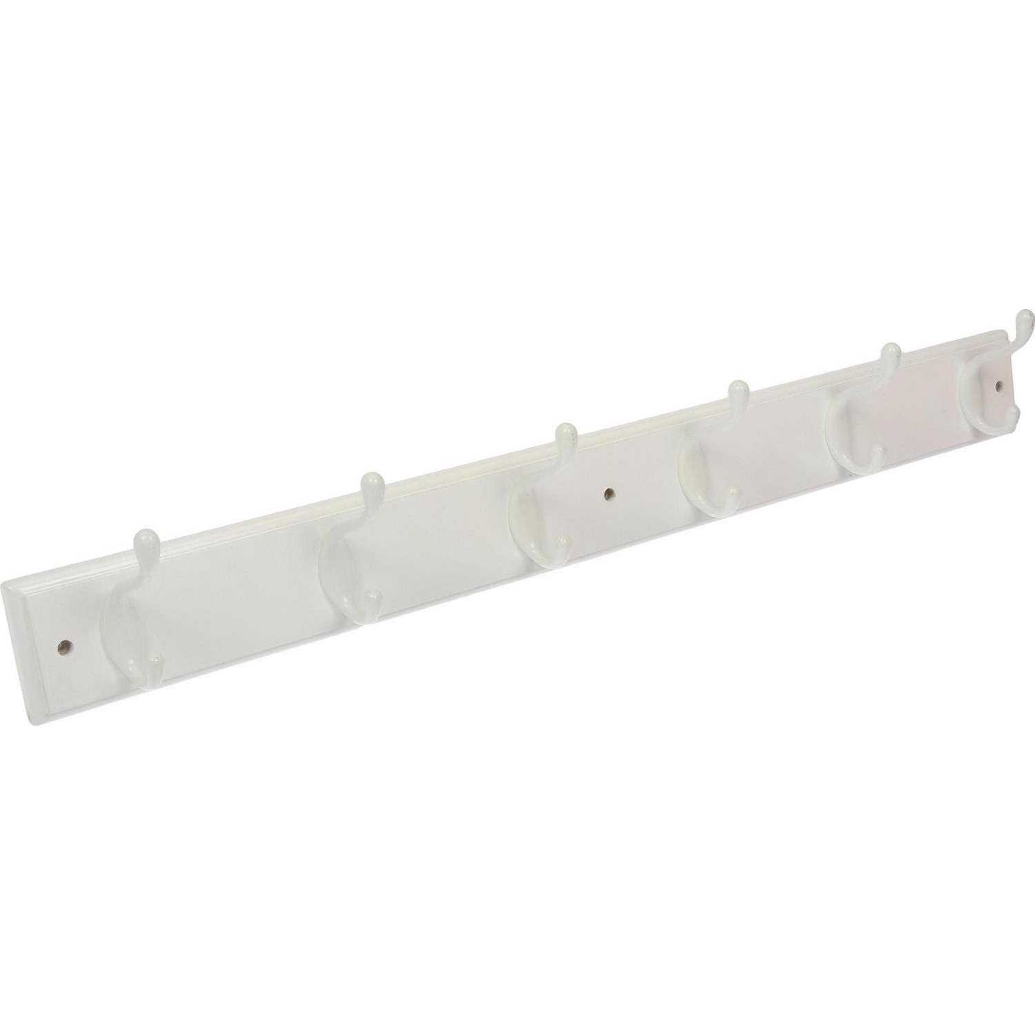 Add an attractive wall-mounted permanent storage solution to the entryway of your home, by the back door, and even in the laundry room with this 27-inch hook board. This hook board can accommodate up to 45-pounds when mounted to wood. The white colored board features six equally spaced double hooks in a simple white finish add flexibility to your storage needs. The board is ideal for hanging jackets, scarves, umbrellas, backpacks, and even dog leashes. Mounts easily to drywall or solid wood and has pre-drilled screw holes with caps that stylishly cover the hardware.