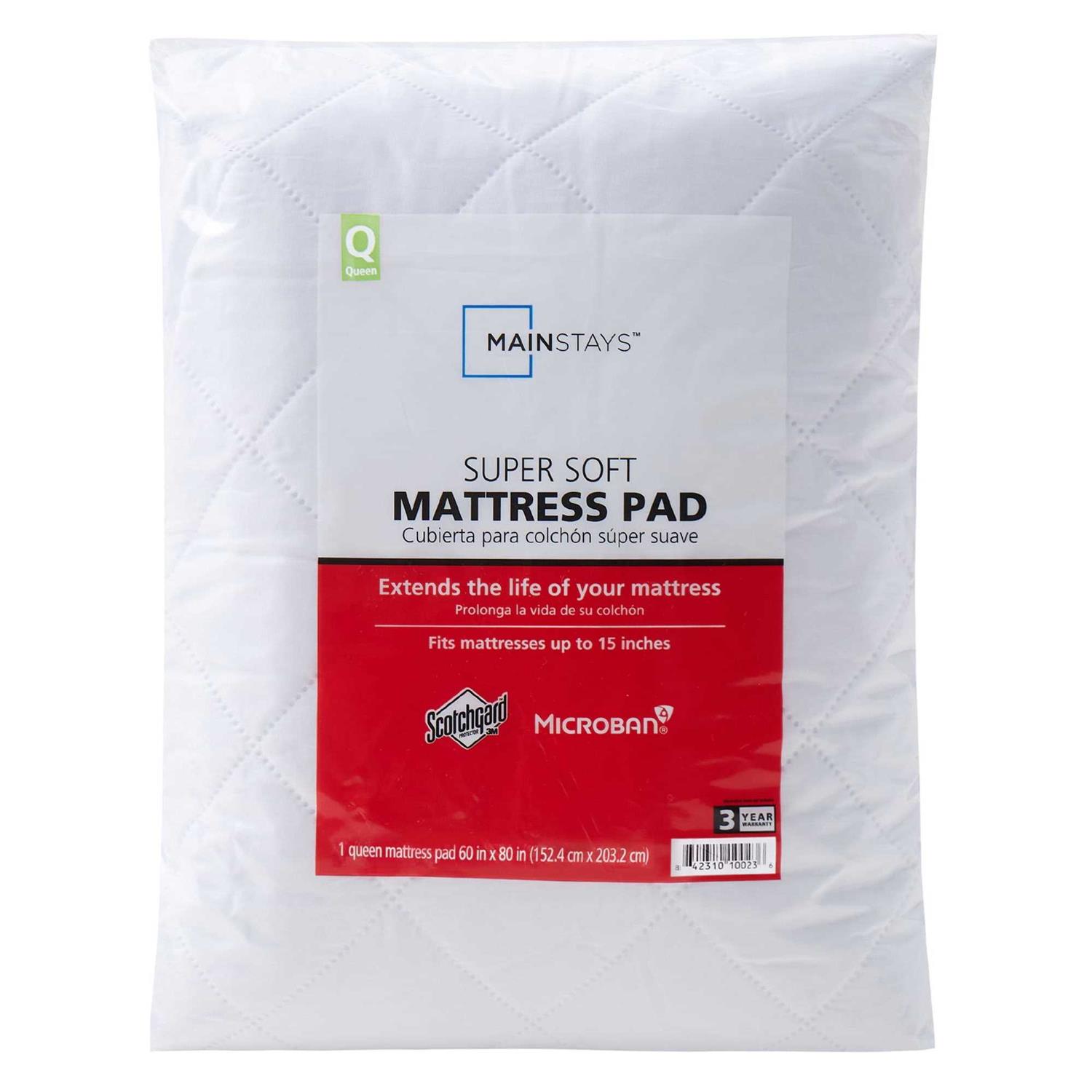 Keep your mattress protected with the Mainstays Super Soft Mattress Pad. The Mainstays Super Soft Mattress Pad, Antimicrobial, features a 100% polyester microfiber top treated with Scotchgard Stain Release and Moisture Wicking to help keep the pad looking fresh and clean while wicking away moisture for cool and breathable fabric. 100% polyester fill is treated with Microban Antimicrobial to reduce odor and improve freshness. The Mainstays Super Soft Mattress Pad, Antimicrobial, helps extend the life of your mattress and has a skirt that fits mattresses up to 15 inch thick to stay in place firmly without slipping and sliding during the night. Easily cared for, simply machine wash this pad as needed. Available in Twin/Twin XL, Full, Queen, and King Sizes.