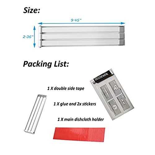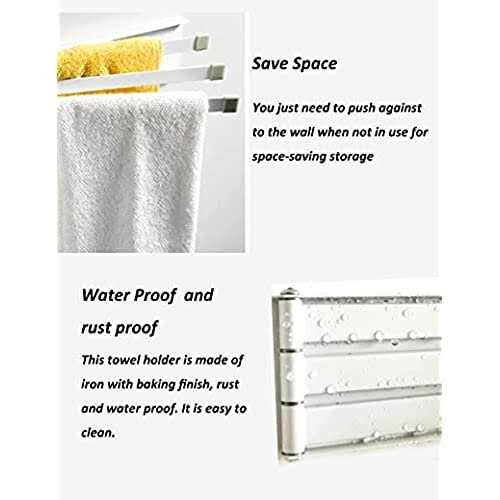 SAVE SPACE: This towel rack do not take up the space and push against to the wall for space-saving when not in use , It is ideal dish rag storage organizer for bathroom, kitchen, sink, door, wall, etc. Quick dry & Keep hygiene: 3 swing arms with length 9.45” can rotate 180 degrees and separate the distance of the kitchen towels, hang the dishcloths in right height with ventilated place. Keep hygiene and neat in your home Installation methods: 1.non hole mounting for hard and smooth wall (like tile and marble) include glue mounting and double side adhesive tape mounting, You do not need to worry to damage the wall for the double side tape mounting. 2. DIY screws mounting, If you do not want the hole-free mounting and the place not suit for hole-free mounting, such as the paint wall or paper wall, you can DIY with drilling. (The screws not include in the pack) Quality design: Iron, baking finish with rust resistant. Easy to clean. A unique non-slip buckle on the tail of each arm to prevent towels from slipping and to avoid scratching Product size: 9.45” L X 2.36” H X ” 0.4THK, Arms length:9.45″ 3 Swing Arms Towel holder Wall Mount Towel Rack