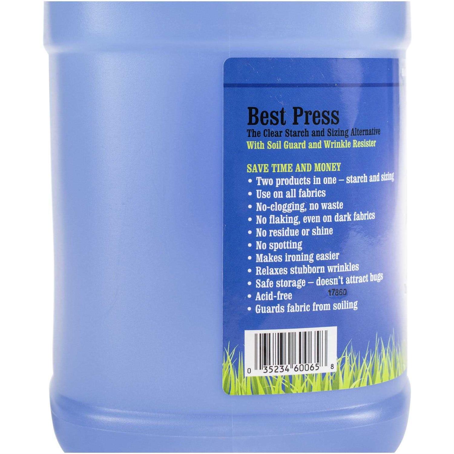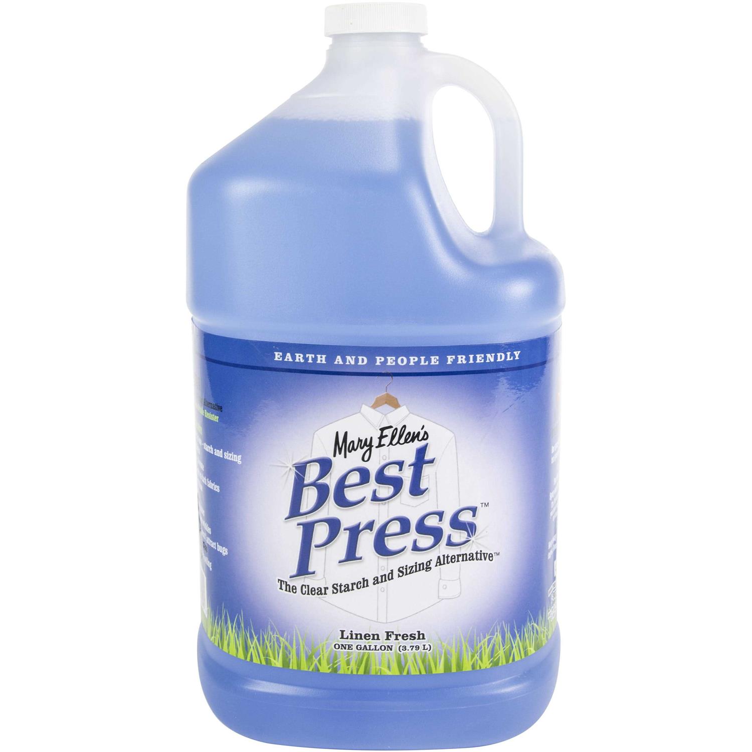 Mary Ellen’s Best Press Refills 1gal-Linen FreshThis is a clear starch alternative with soil guard and wrinkle resister. A clear, crisp starch with a lovely scent that makes ironing more enjoyable. It’s non-flaking (even on dark fabrics), non-clogging, acid-free, leaves no residue behind, relaxes stubborn wrinkles, makes clothes soil-resistant and does not attract bugs. It make fabrics look like new! Available in a variety of wonderful scents as well as scent-free. This 6.25×11.5×6.25 inch package contains one gallon of Best Press in a shatterproof bottle. Made in USA.