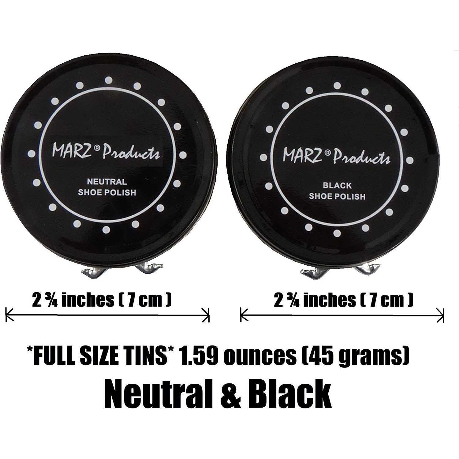 Deluxe Shoe Care Kit – 8 Pc: How to Shine and Care for Your Shoes Remove the laces from your shoes before starting to polish them. Clean the dirt and debris from your shoes. Debris can become embedded in leather if it is not cleaned off prior to polishing. For best results, it is recommended to clean your shoes with a cleaning wipe or damp rag and allow them to dry before applying polish. If your shoes are dry & cracked, apply a leather conditioner (not included). Just as your own skin can crack and become dry, so can leather. Apply the conditioner with a clean cotton cloth and allow the shoes to completely dry before proceeding to the next step. Apply polish evenly to the entire body of the shoe. A thin layer of polish will do it, but you need to make sure that it is evenly applied to avoid spotting on the leather. Let the polish dry before proceeding to the next step. Shoe polish should be applied with a clean cotton rag or the foam applicator. Use the smaller brush to rub polish deep into the area between the heel & shoe uppers. Buff your shoes until they shine: First use the large brush; then use the buffing cloth in a brisk side to side motion for the final shine. NOTE: The kit contains one tin black shoe polish & one tin neutral shoe polish. The black polish can only be used on black shoes. The neutral polish can be used on any color shoe.