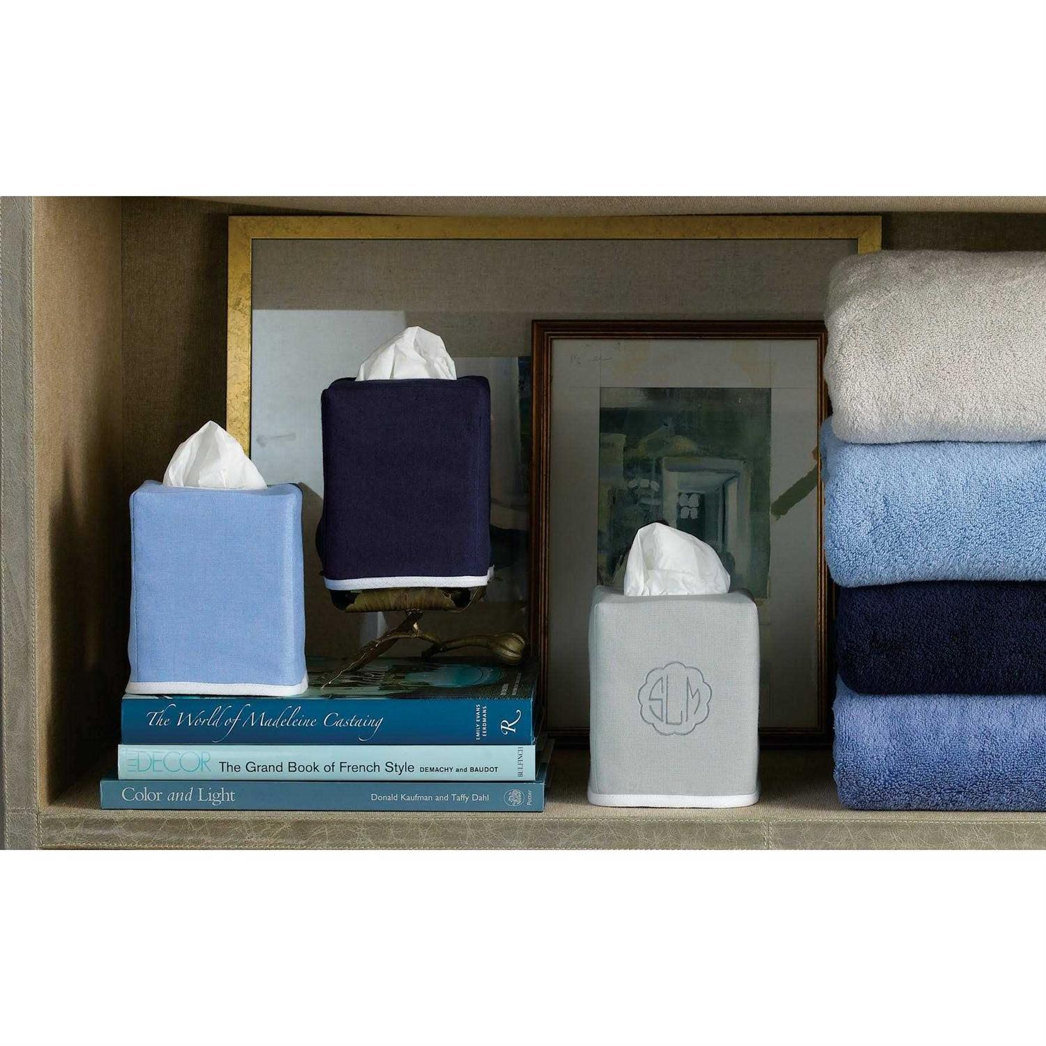 In a home where no detail goes unconsidered, our Chelsea tissue box covers coordinate seamlessly with the surrounding space. Available in your choice of eight pristine shades, these 100 percent linen covers are framed in white piping for a preppy pop of color.