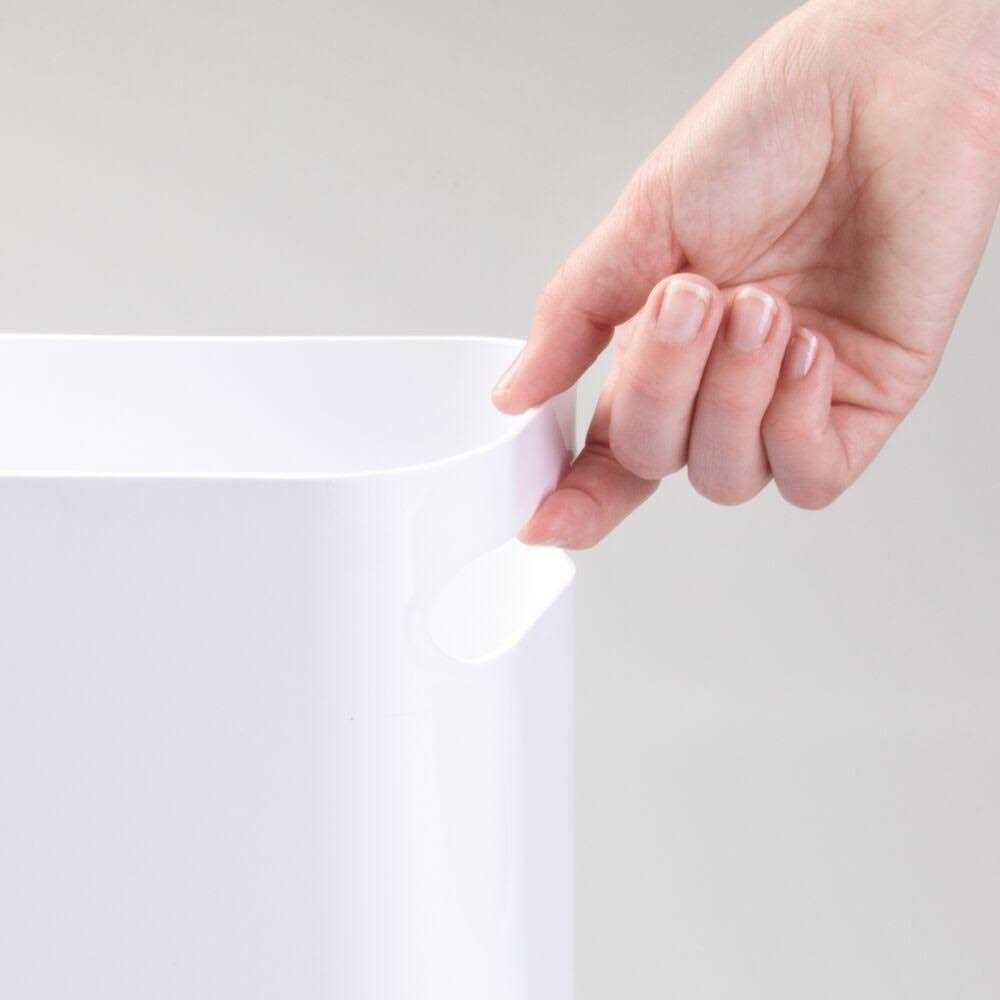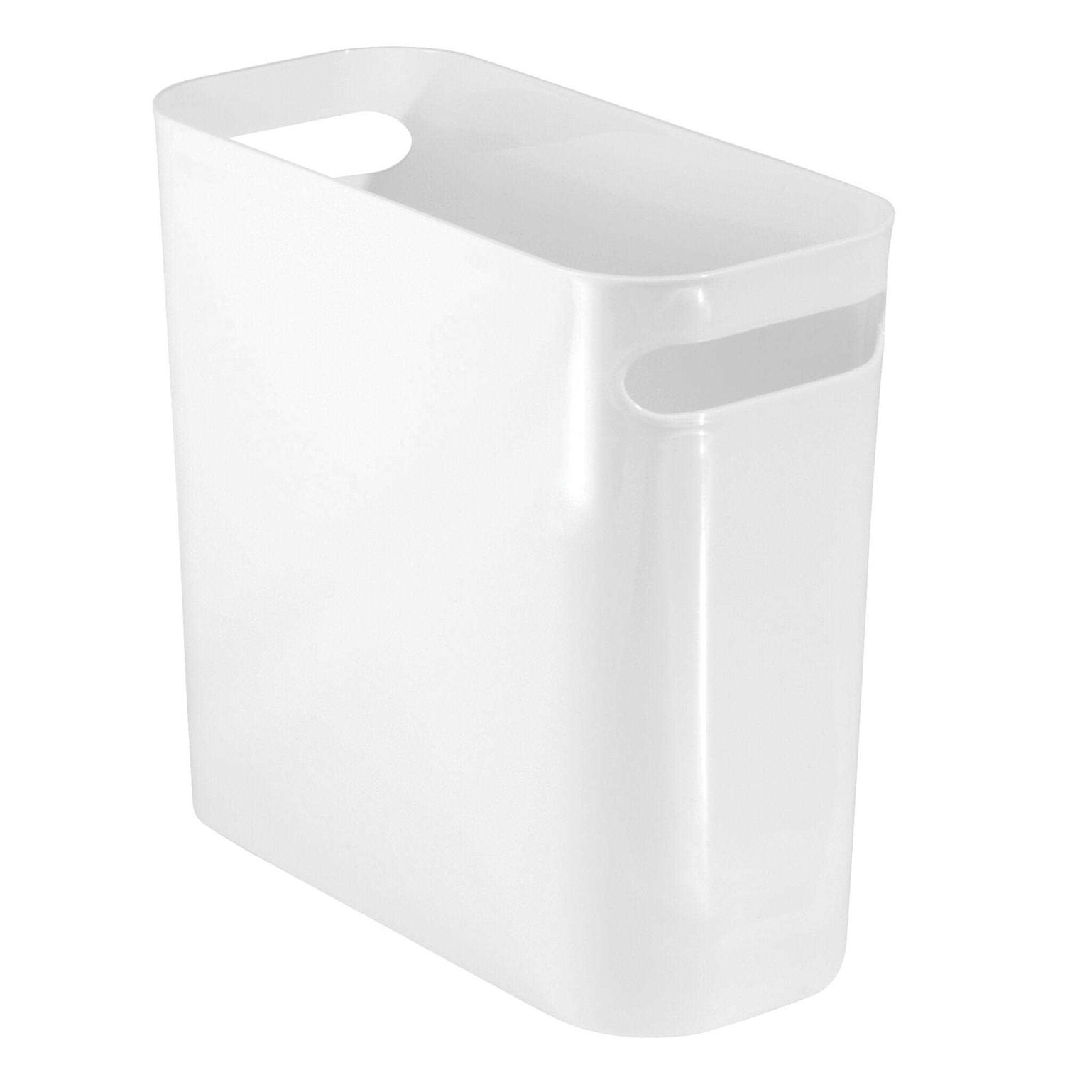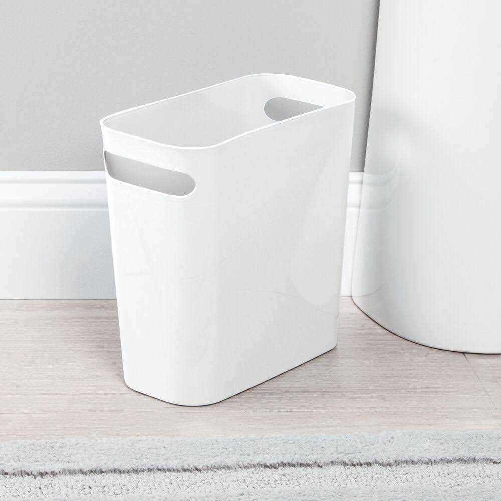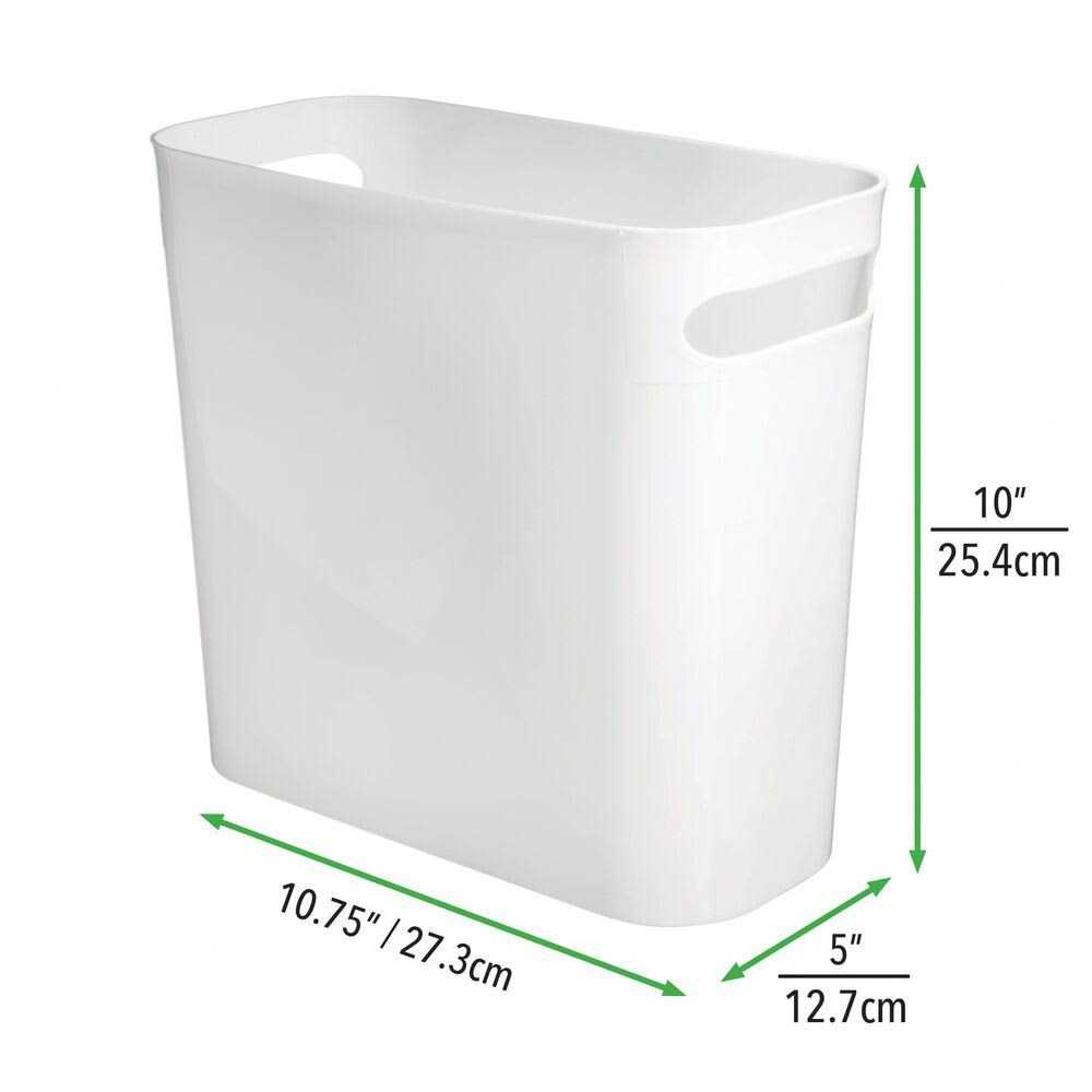 This mDesign Plastic Wastebasket Trashcan provides ample room for collecting trash or recycling. Its compact design easily fits into small bathroom areas and can be discreetly stored when not in use. Integrated handles make carrying and emptying the container simple! Compact wastebasket trash can with ample room for garbage or recycleIntegrated handles make carrying and emptying easyModern design fits well with any bathroom decorMade of durable white plastic10 x 5 x 10.75 , 6 quart capacity