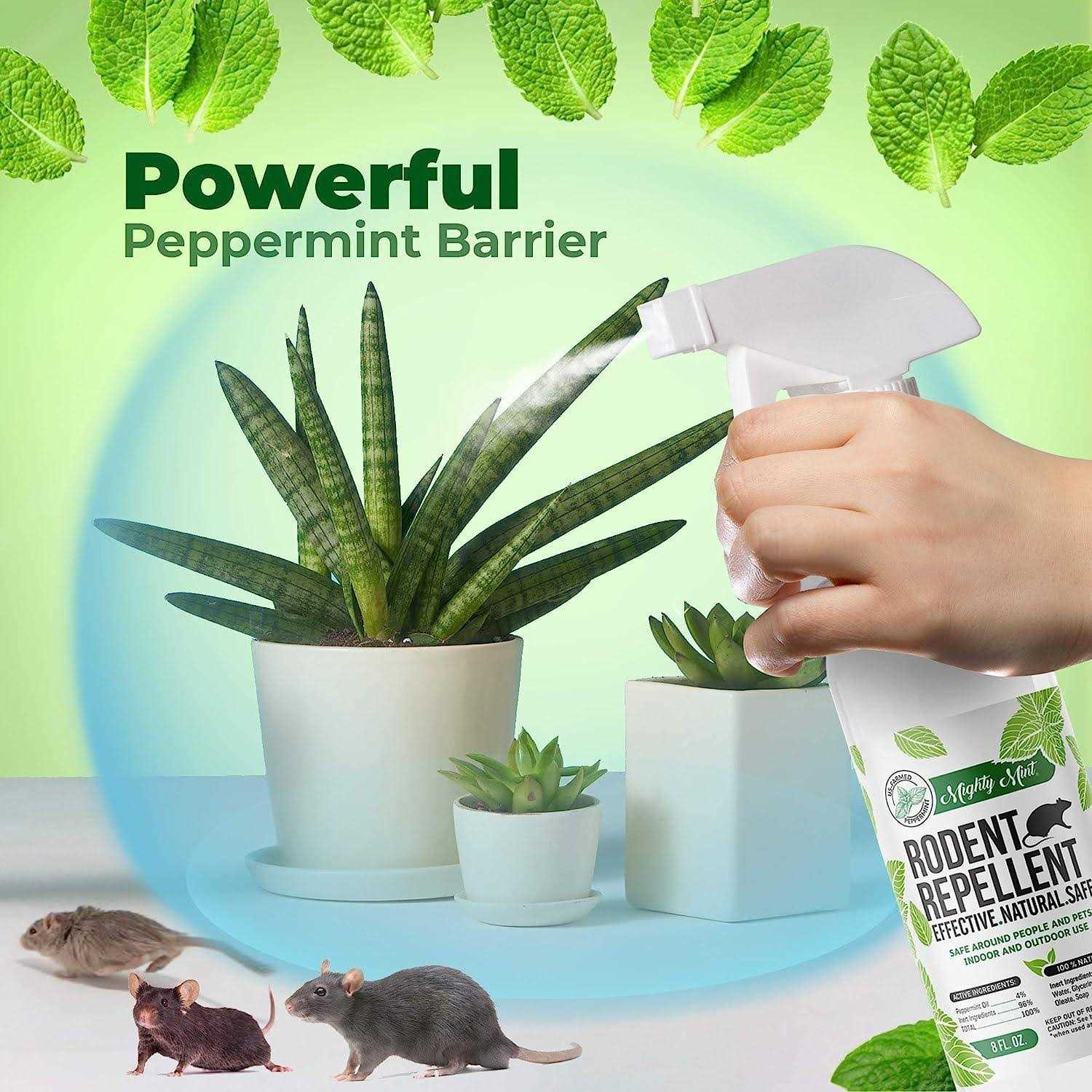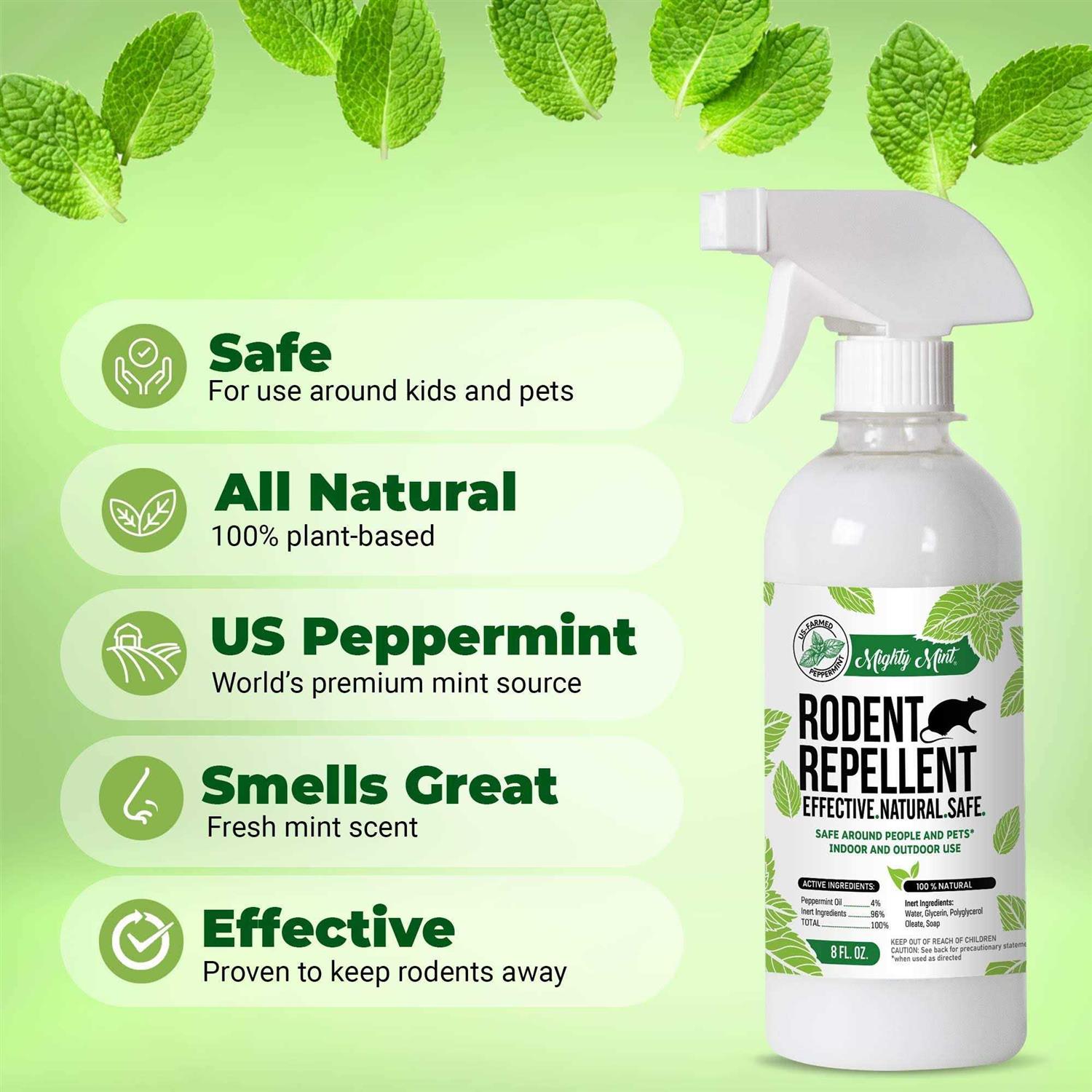 Get rid of mice, rats, and more without poisons or traps! Mighty Mint Rodent Repellent is a natural spray created to keep rodents from your home without compromising on safety. It is safe to use around dogs, cats, and people when used as directed. This formula is made with natural peppermint essential oil – a proven effective natural deterrent for mice and other rodents. The secret to Mighty Mint is the incredible repellent power of real Northwest peppermint oil. This formula improves upon traditional peppermint repellents with a special blend of plant-based ingredients. The scent is pleasant to humans, but irritating to unwanted pests. Just a few sprays every few days is enough to keep mice and or other rodents away. Useful for homes, kitchens, garages, storage areas, car engine cables – anywhere that needs to be protected. For best results, use as a preventative measure before rodents have nested.