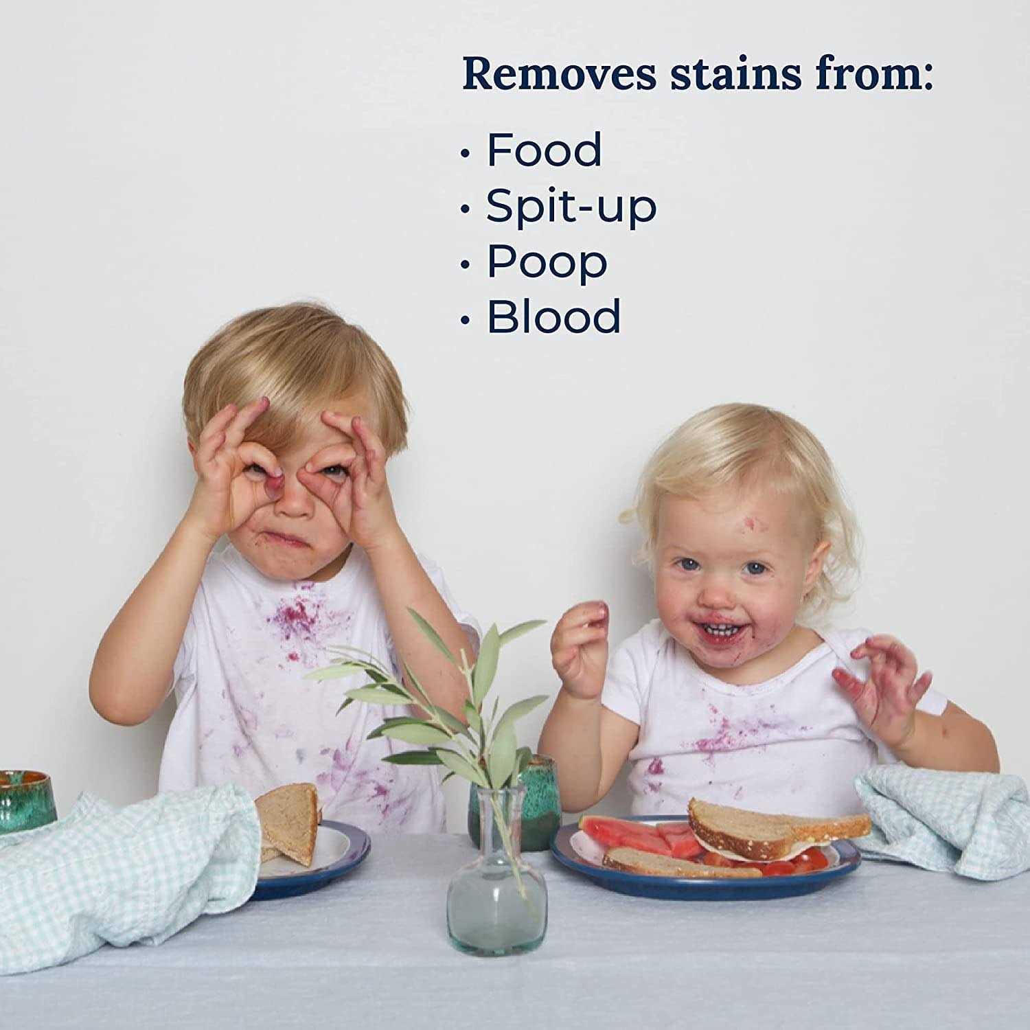 - Quickly and safely removes food stains from clothing, bibs, cloth diapers, furniture, carpets, linens and more; simply spray, blot and launder