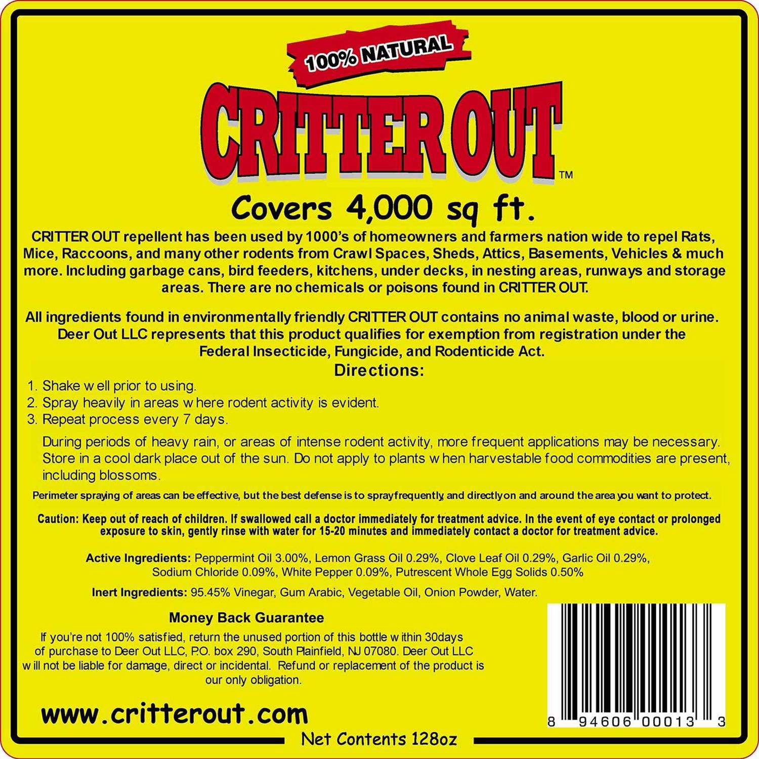 CRITTER OUT rodent repellent, Minty Fresh Scent! The one that works! Pests and rodents literally flee the area after spraying Critter Out. Get rid of Rabbits & Groundhogs now!