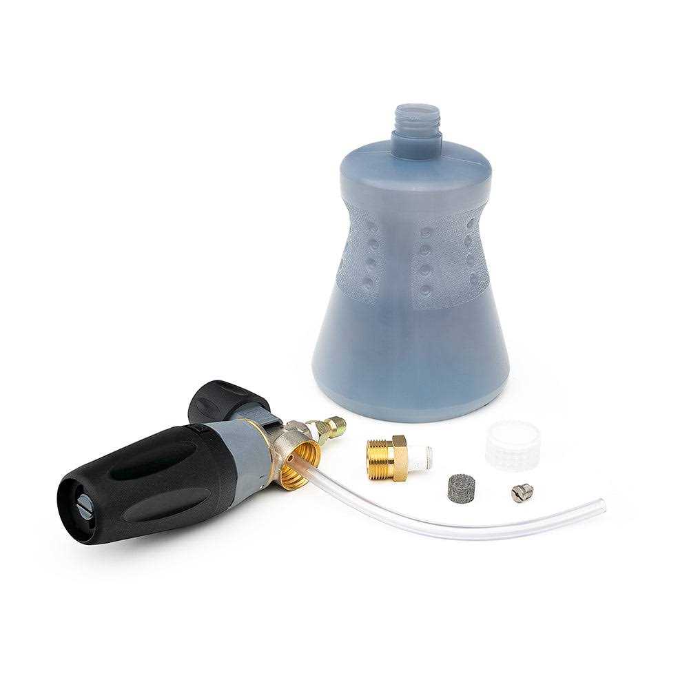 MTM Hydro’s Italian Manufactured PF22.2 foam cannon stands alone as the most reliable foam cannon in the industry. With its new standing one-liter foam cannon bottle, you no longer have to worry about spills and tipping over. Whether you are foaming down your car on the weekend or are a professional contract cleaner foaming hog barn for hours, this tool will save you time and money. Simply attach the foam cannon to your pressure washer using one of the included fittings, fill the foam cannon bottle with your desired ratio of cleaning liquid, and you are up and running. The MTM Hydro PF22 launched in 2017 as the latest and greatest foam cannon to hit the world stage. The PF22 offers both, adjustable fan blades, and a two stage nozzle allowing you to spray vertically and horizontally. By adjusting the fan blades (narrow or jet) MTM Hydro Foam cannons throw thick foam onto your vehicle, pole barn siding, house, fence, sidewalk, roof or other washable items. The chemical injection knob on top of the PF22 also clicks and allows for precise measurement of more or less chemical to be drawn through the internal chamber, increasing or decreasing the foam output. This allows the internal agitator to create a dense foam that is stickier than the Chinese knock-off foam cannons. In doing so, this thick foam has a longer dwell time which allows the chemical to work on the cleaning surface for longer in its effort to emulsify the dirt and grime. some surfaces may still require some elbow grease, however, if the chemical does its job, very little (if any) scrubbing is required.